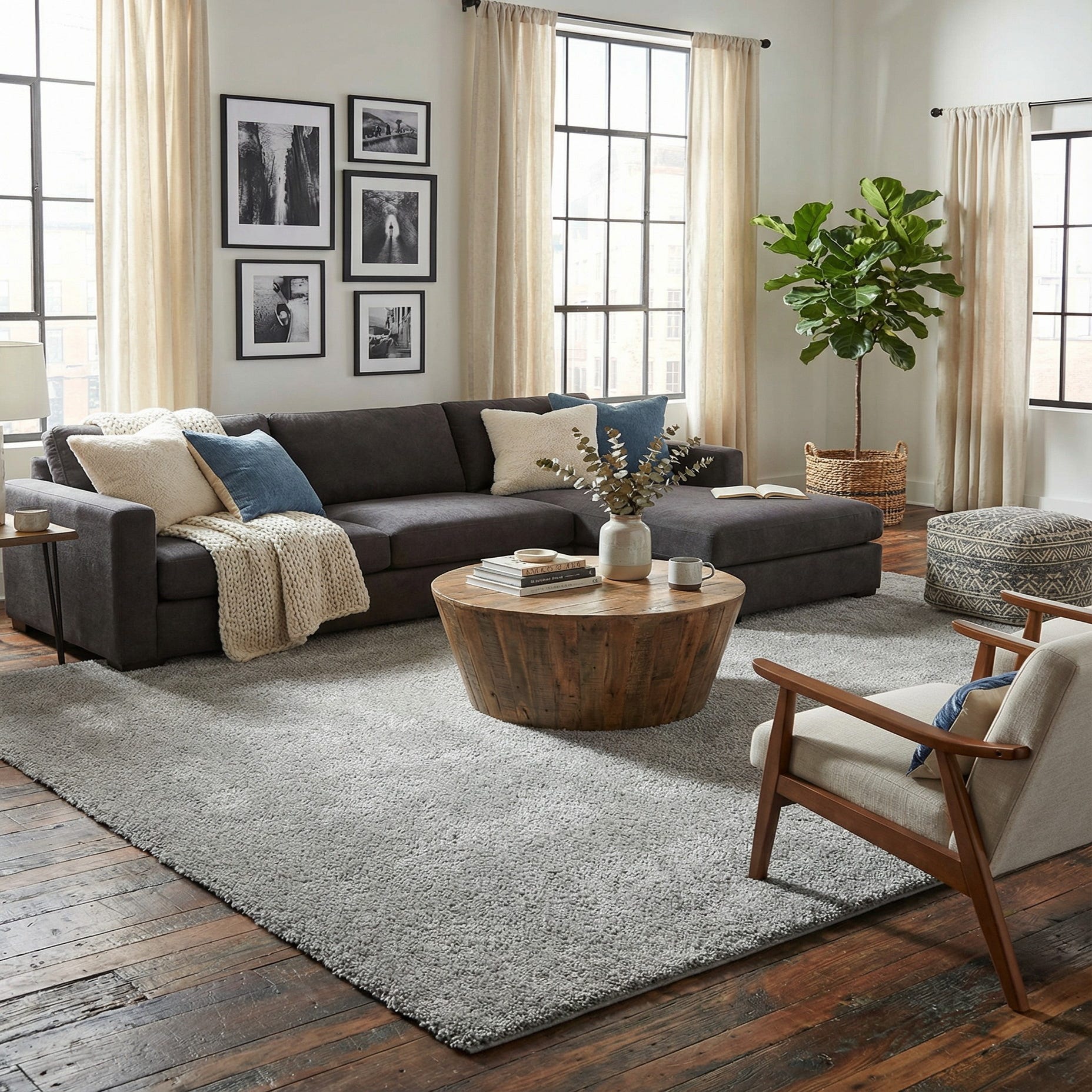 Machine made from 100% polyester, the dense shag pile feels plush and yielding underfoot, making it a natural choice for spaces where comfort matters. Place it beneath a living room seating group to define the conversation area, layer it under bedside tables for a warm, tactile start to morning, or use it in a home office or media room to soften acoustics and add a cozy element. It pairs well with Scandinavian, modern, and transitional interiors, and complements both cool and warm accent tones.