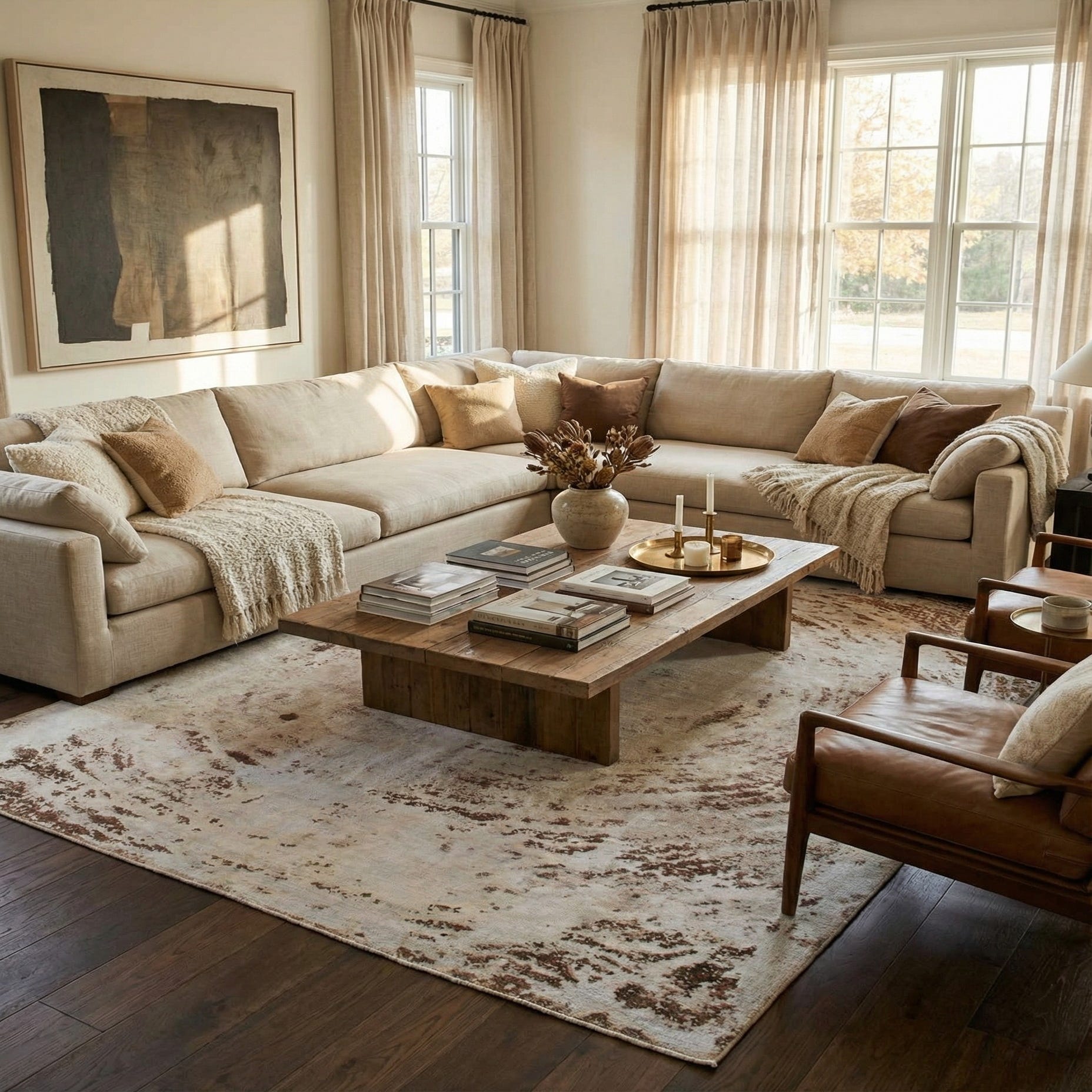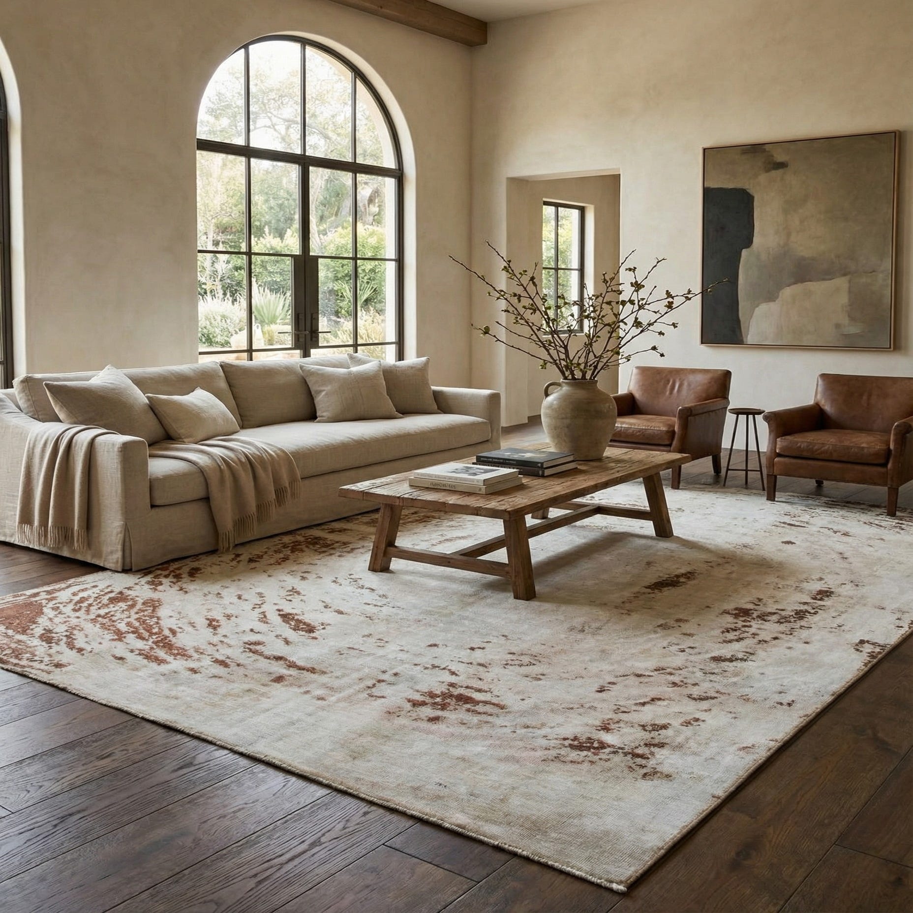 The rug's natural wool construction delivers a plush, comfortable feel underfoot, enhanced by the meticulous hand-knotted weave that contributes to its durability and longevity. The subdued and neutral tones harmonize effortlessly with contemporary, minimalist, and even industrial decor, anchoring rooms with its grounding design. Ideal for a living room, dining area, or sizable foyer, this rug complements wooden or polished concrete floors, and would stand out beautifully against monochromatic furnishings or amidst a more eclectic mix of textures and materials. It is well-suited for those looking to add a tactile, visual anchor to their space without overwhelming it with bright colors or busy patterns.