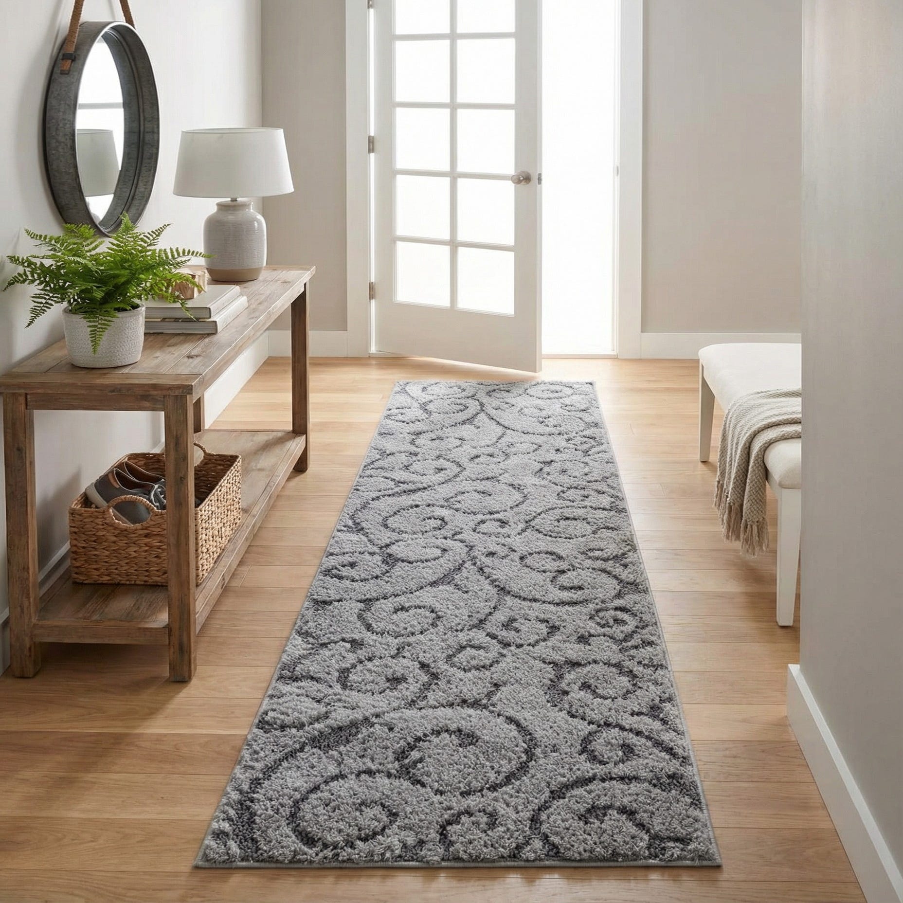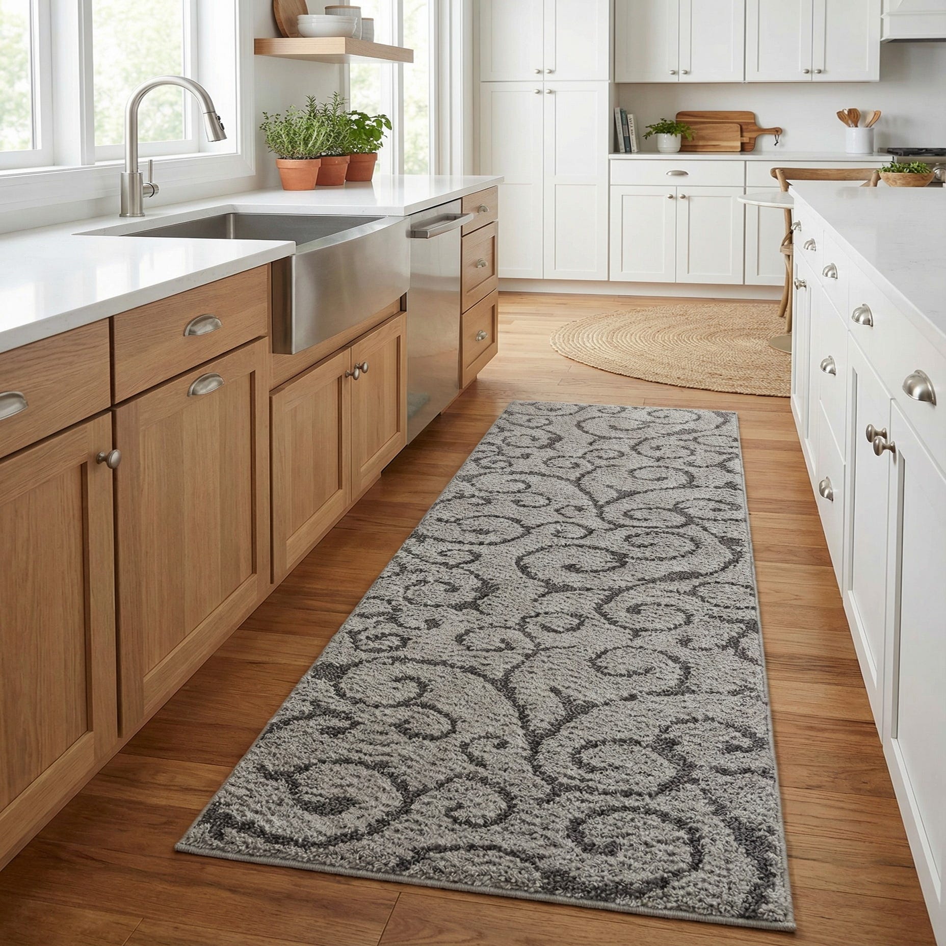 Designed as a runner, it fits long, narrow spaces—hallways, entryways, kitchen aisles or alongside a bed—where you want added softness and visual interest. The neutral gray palette pairs naturally with light oak or dark-stained floors and works well in Scandinavian, contemporary, or modern farmhouse schemes. Layer it under a slim console, place it beneath a narrow bench, or use it to tie together monochromatic furnishings and metal accents for a cohesive, textured look.