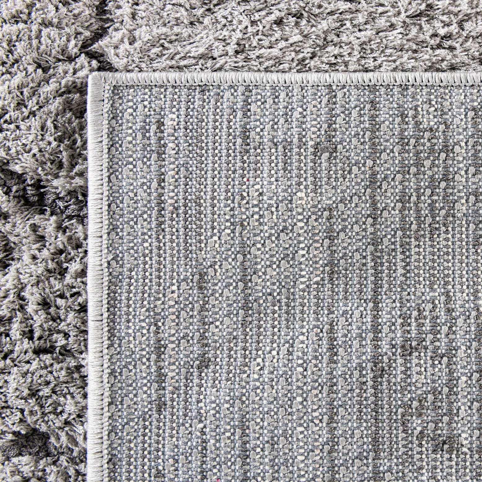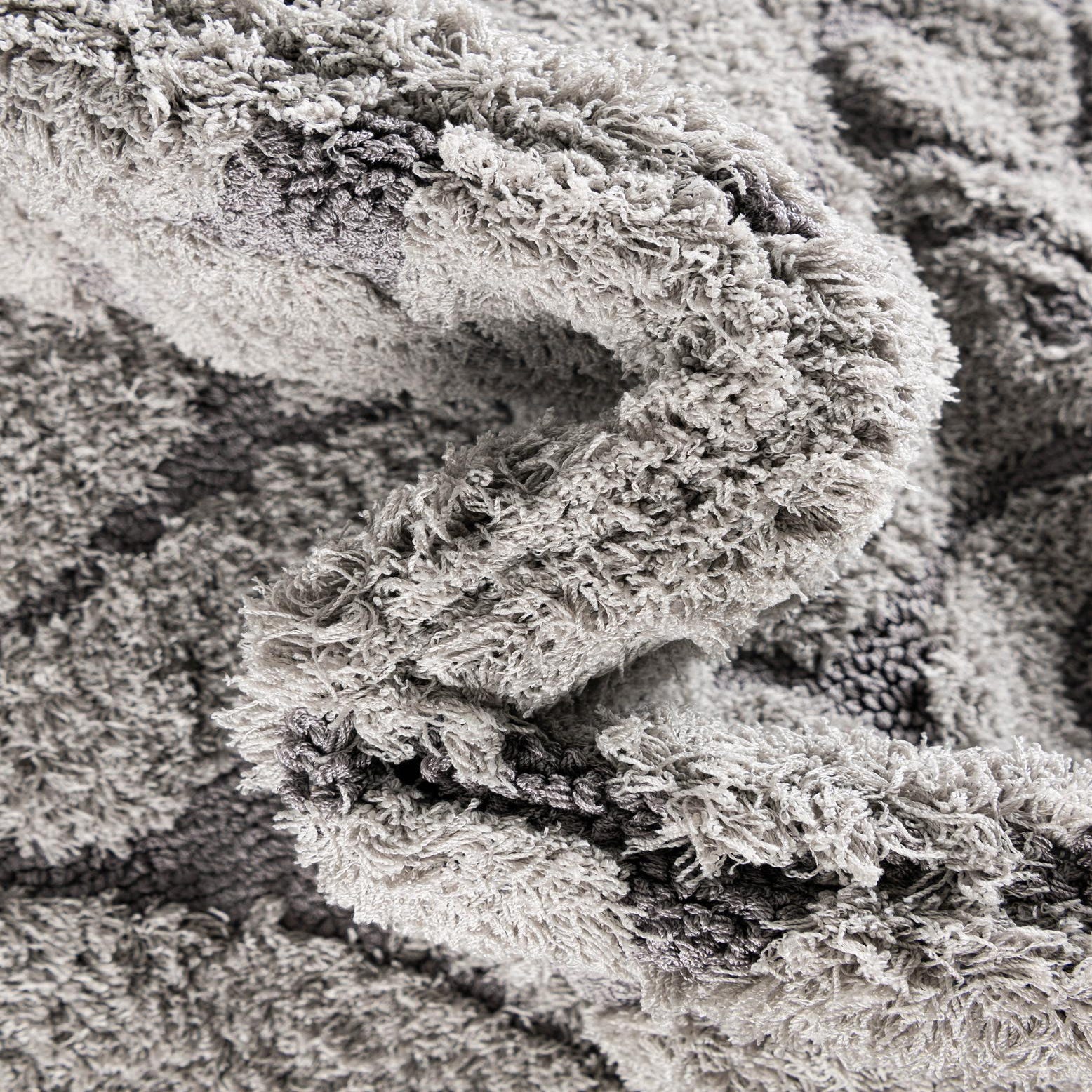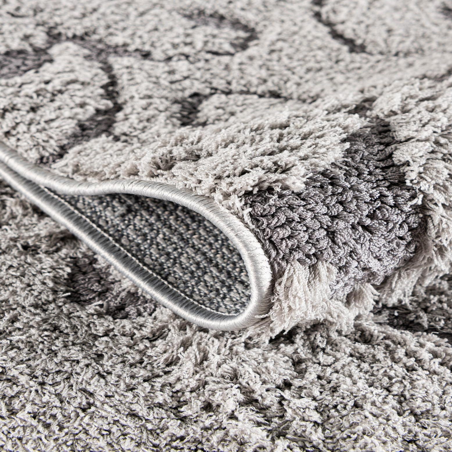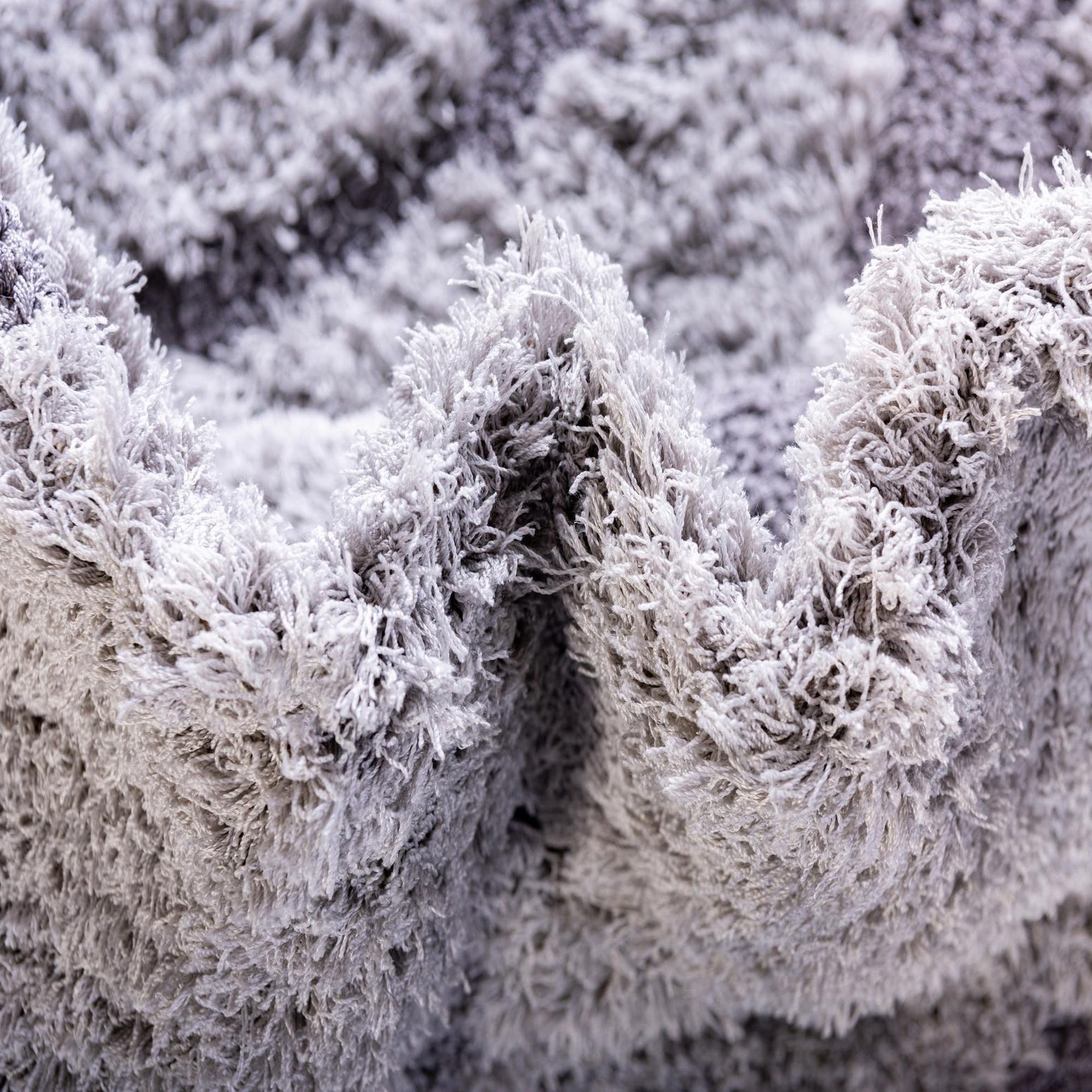 Soft, sculpted shag pile shapes an organic scroll-and-bloom pattern across a layered gray field. Raised light-gray motifs rest against a deeper gray ground, giving the design clear definition and gentle contrast without strong color shifts. Machine-made from 100% polyester, the surface feels plush and dense to the touch while the high-low texture highlights the swirling botanical motifs.
