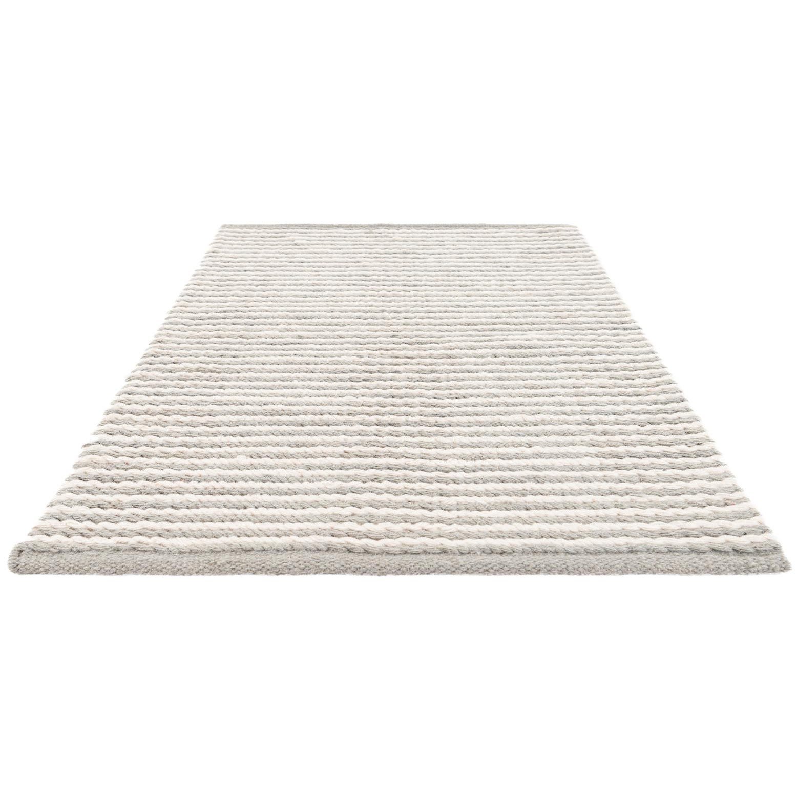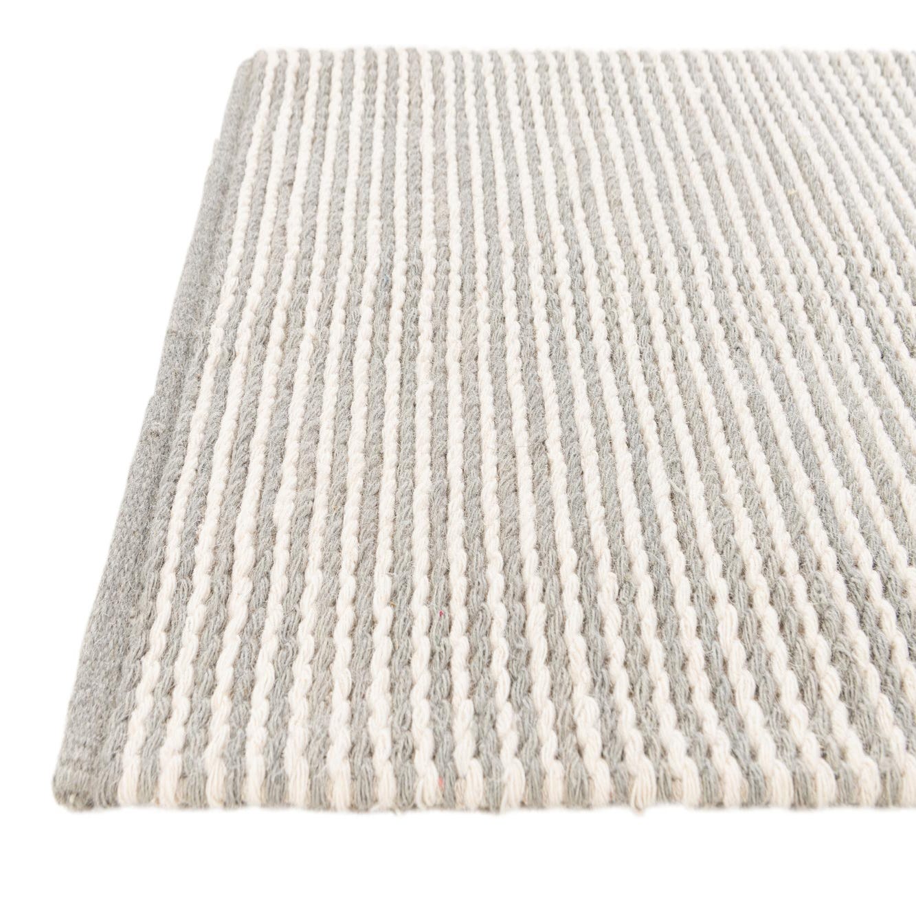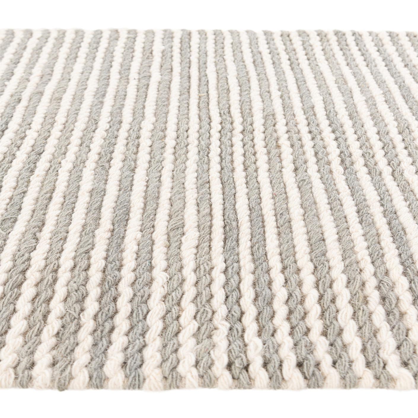 A 2x3 rectangular light gray and ivory modern rug with horizontal stripes, handmade from wool and cotton.