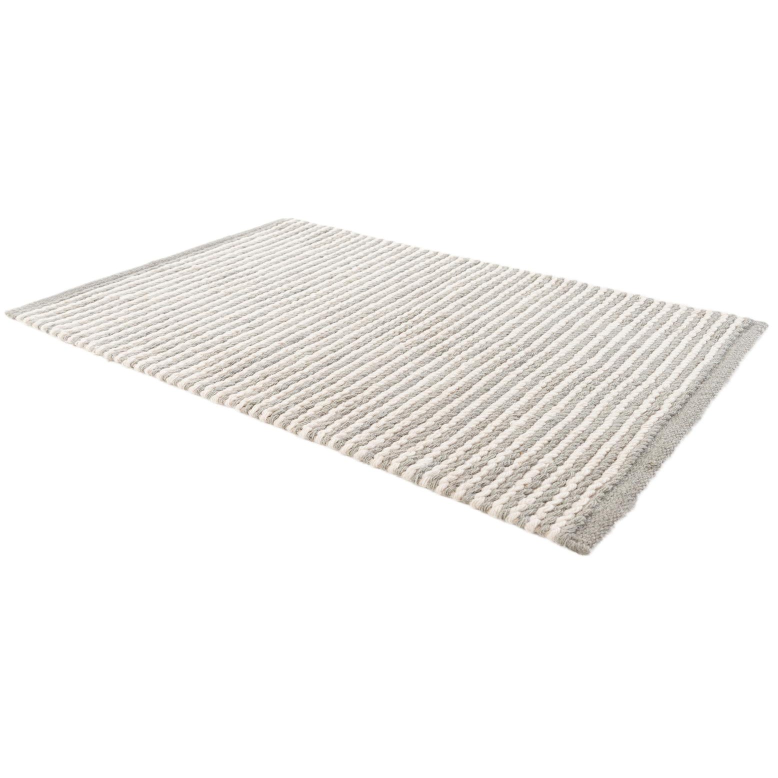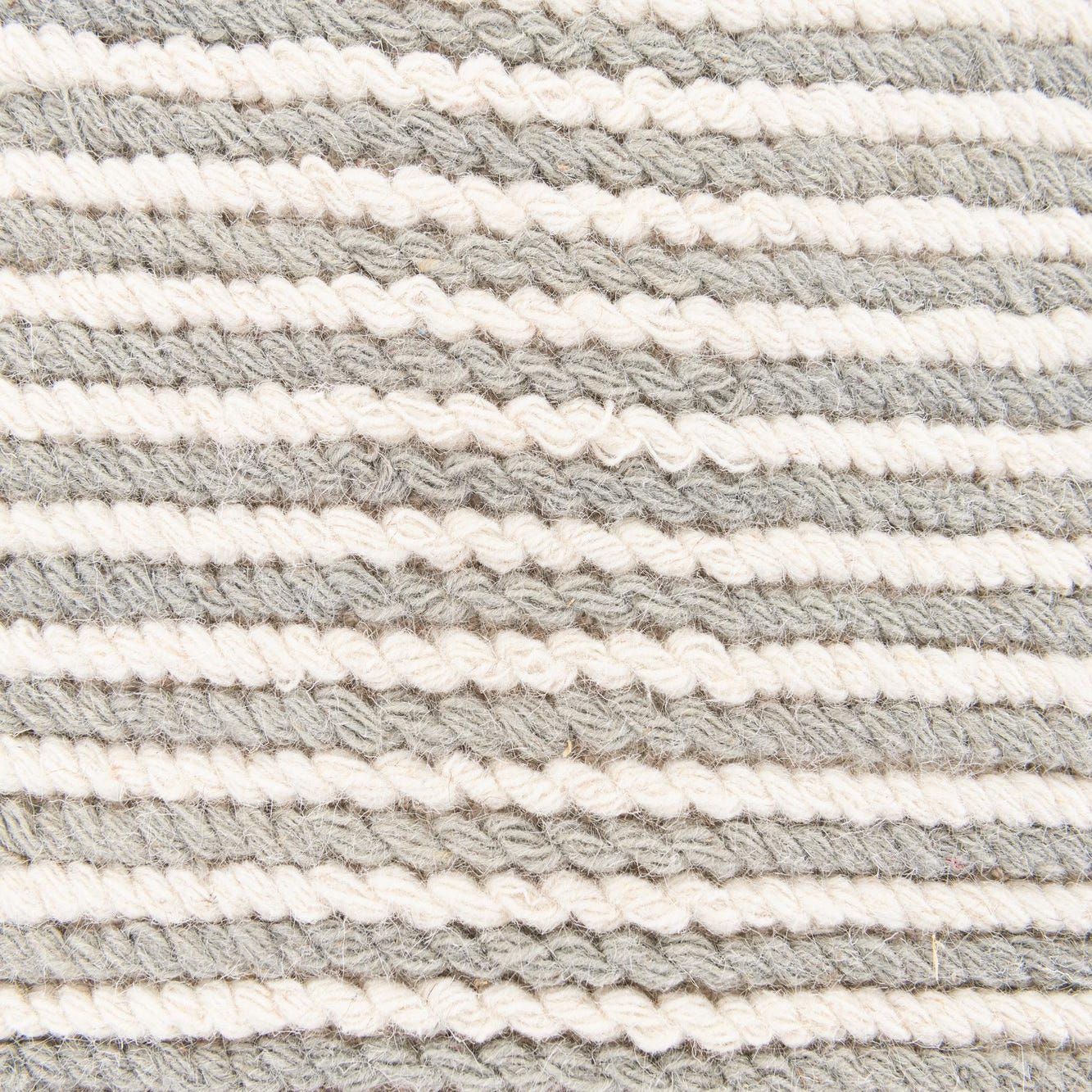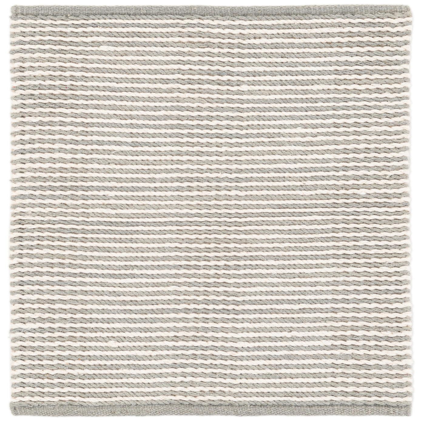 A 2x3 rectangular light gray and ivory modern rug with horizontal stripes, handmade from wool and cotton.