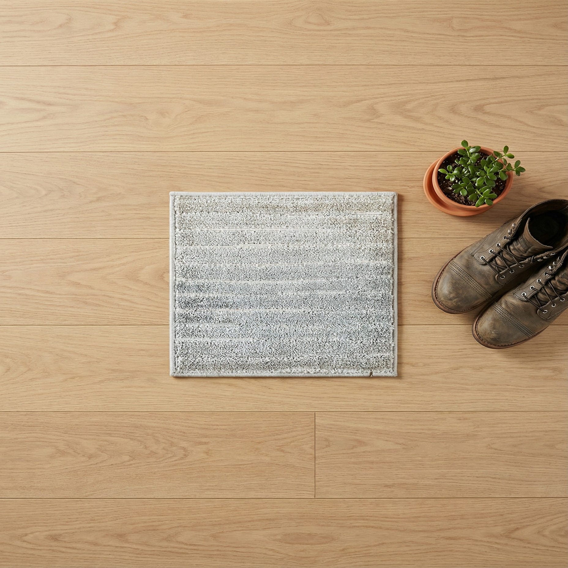 A soft, neutral rug with a light gray background and warm beige accents, this sample displays a subtle linear pattern made up of low, sheared channels alternating with a slightly higher, dense pile. The tonal stripes create quiet movement across the surface without overwhelming a space, and the dense polypropylene yarn gives the rug a plush, cushioned feel underfoot while keeping the texture crisp and defined. Machine-made of 100% polypropylene, the construction creates consistent loop-and-cut definition that reads modern and relaxed.