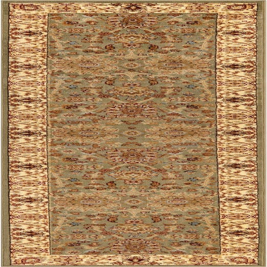 Primary color is Light Green. Colors in this rug include: Light Green, Cream, Light Blue, Red, Rust Red, Tan, Gold.