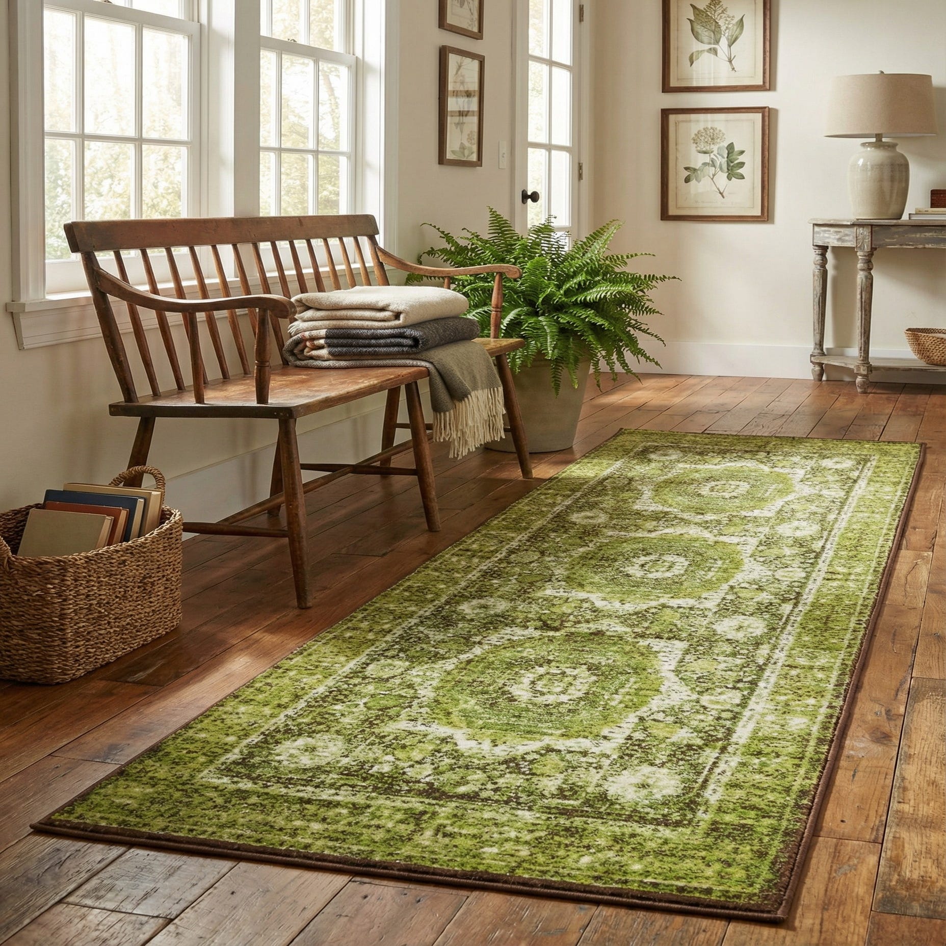 Primary color is Light Green. Colors in this rug include: Light Green, Brown, Green, Ivory.