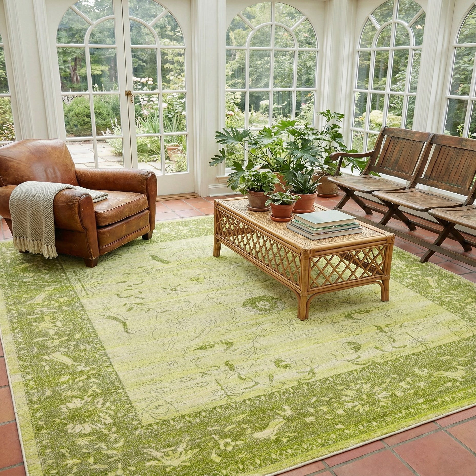 Pair this green-on-light-green palette with natural wood and rattan for a relaxed, sunlit living room or sunroom; it sits beautifully beneath a linen sofa and a light oak coffee table. In a dining space the bordered edge can anchor a table and chairs, or place it in a bedroom to add color beneath neutral linens and brass or matte-black accents. Its versatile scale and tone make it a good choice for defining seating areas in open-plan interiors or for adding refined pattern to a contemporary-traditional hybrid scheme.