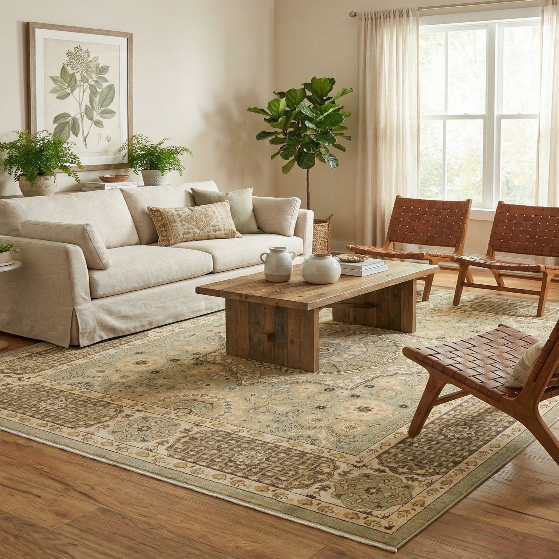 Machine made from 100% polypropylene, the rug has a low, dense pile with a smooth, even surface that feels soft underfoot while maintaining structure across a large area. It pairs well with warm wood furniture, cream or linen upholstery and brass or aged-metal accents; place it beneath a living room seating group to anchor conversation, under a dining table to define a formal dining space, or in a study or bedroom to add layered pattern and muted color.