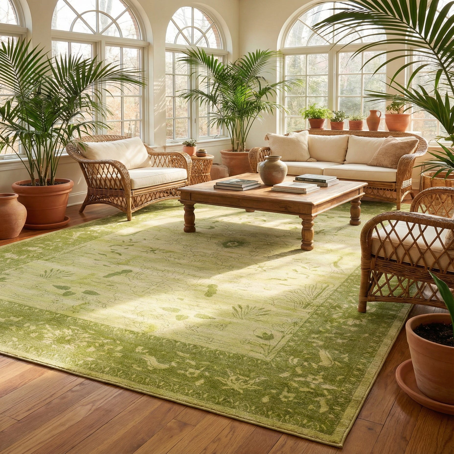 This palette and style suits a range of interiors: pair it with white-painted millwork and linen upholstery for a coastal or cottage look, with natural wood and rattan for a relaxed, organic feel, or with simple mid-century pieces to add a touch of softness to a modern living room. It also works well in a bedroom or sunroom to introduce a calm wash of color that anchors furniture and ties together mixed natural textures.