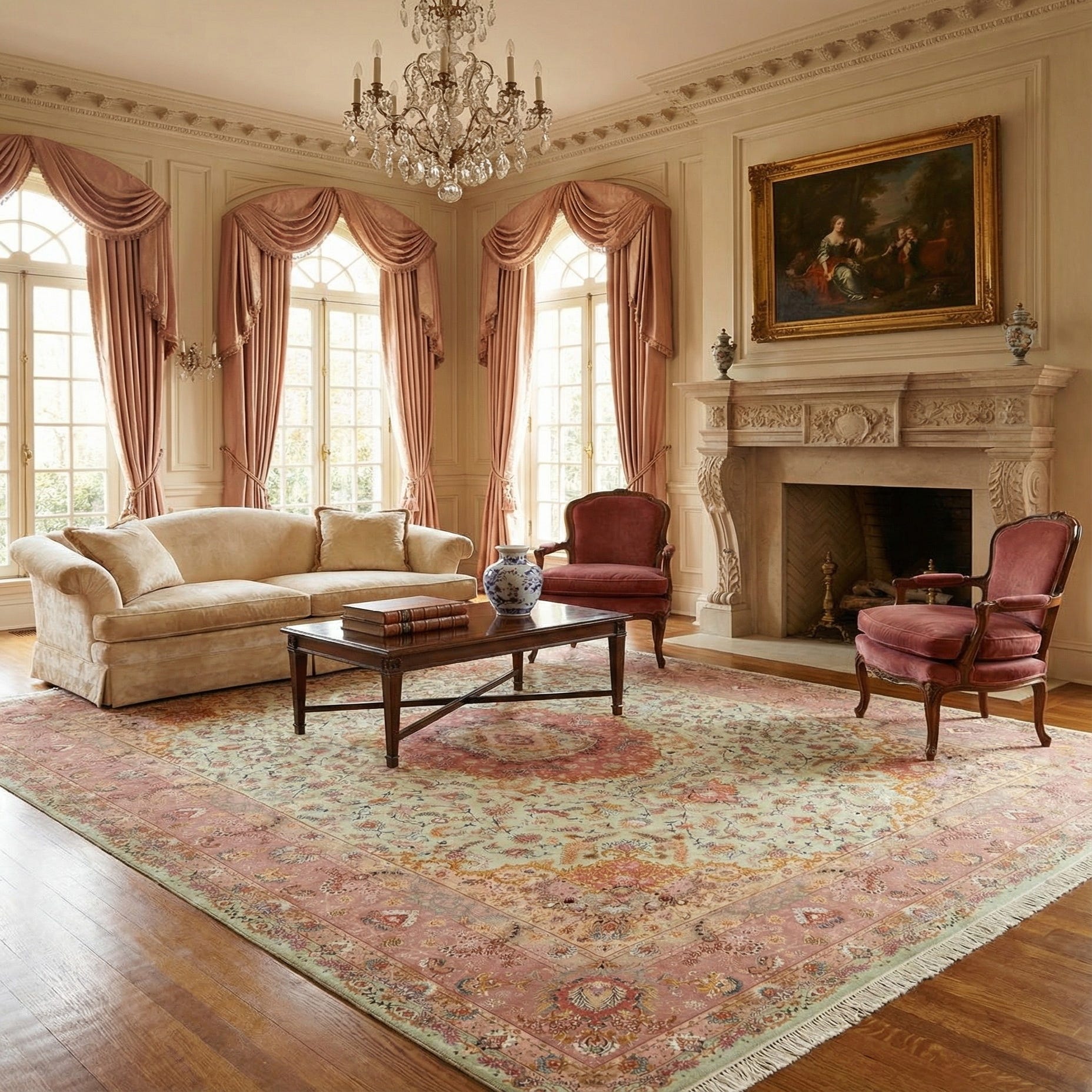 A 10x13 rectangular green Persian rug with a central pink medallion and intricate botanical patterns, perfect for a living room.