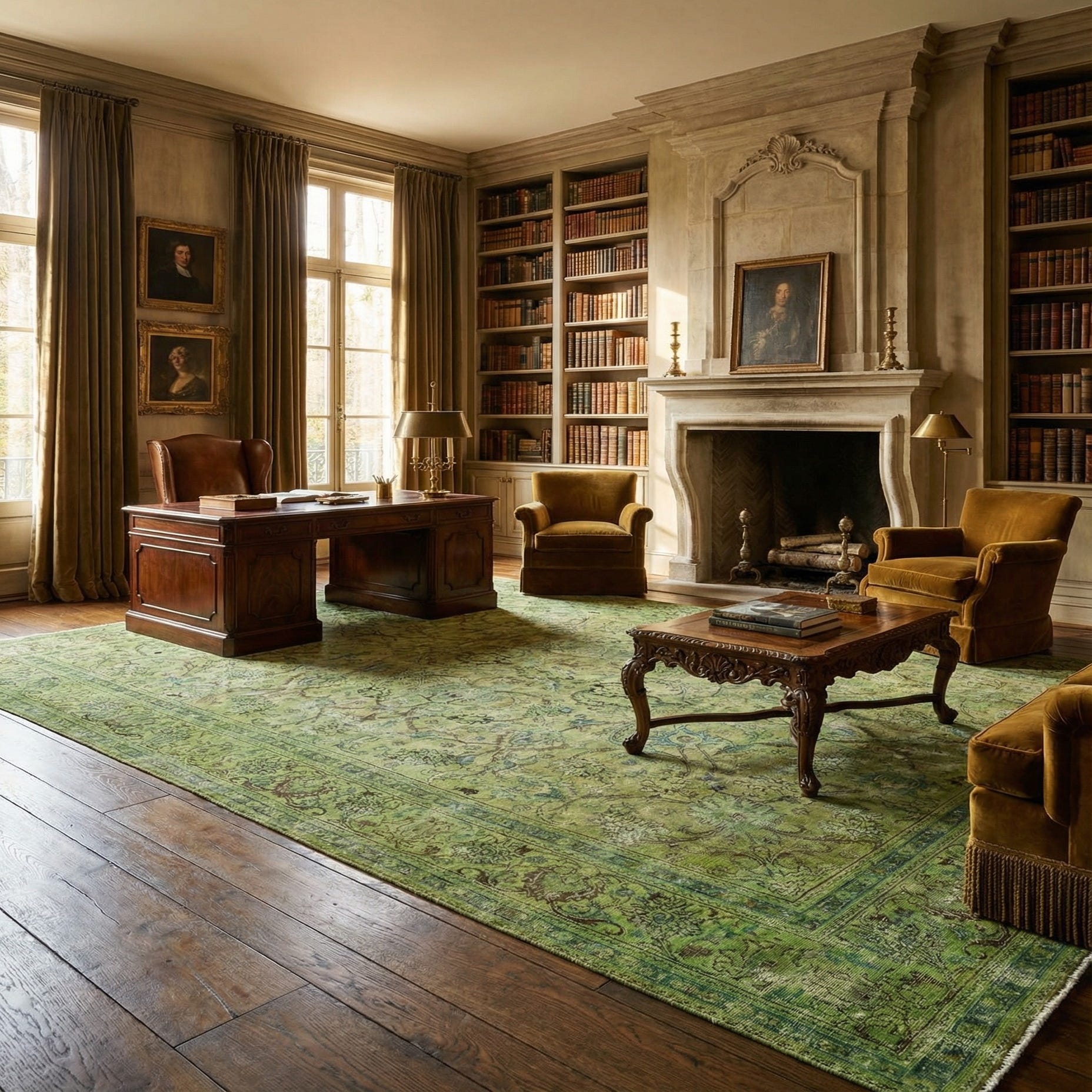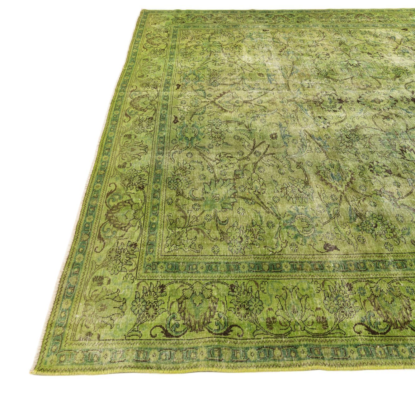 A 10x13 rectangular green vintage wool rug with an intricate oriental medallion pattern and floral border.
