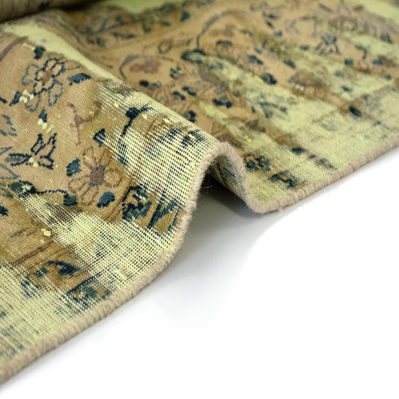 The Vintage Royal collection presents a 10x13 hand-knotted rug, meticulously crafted from 100% wool. This rug showcases a harmonious blend of light green, brown, dark blue, and olive hues set against a light green background, lending itself to a serene yet distinguished aesthetic.