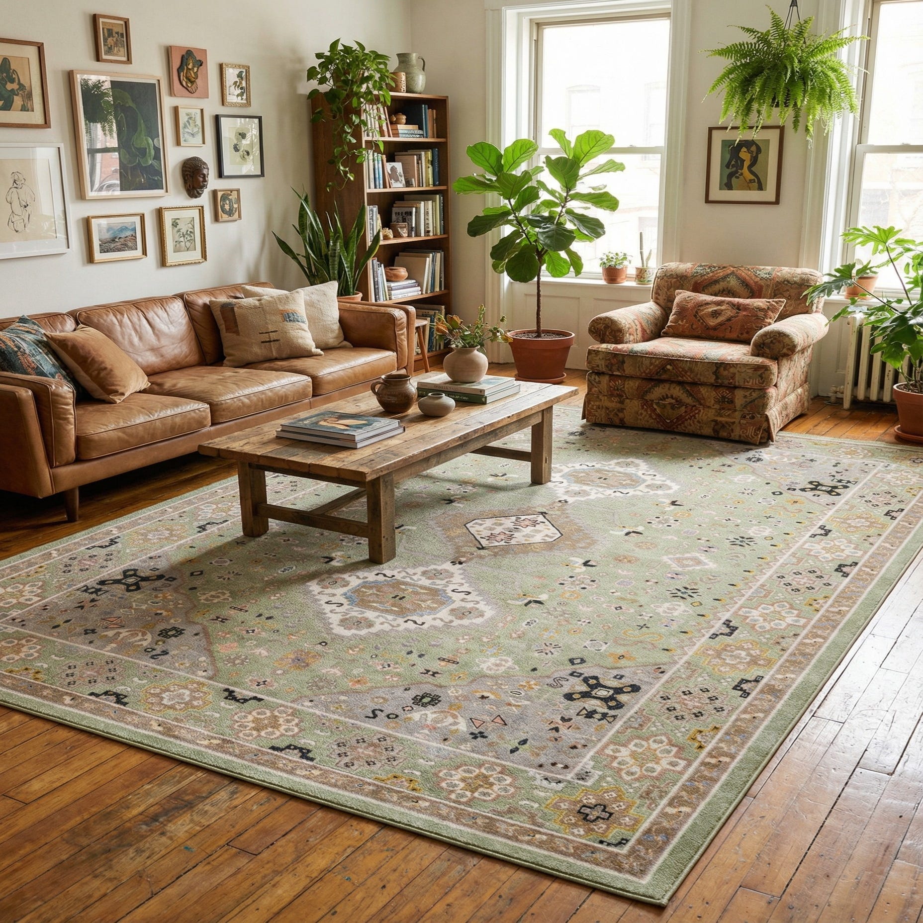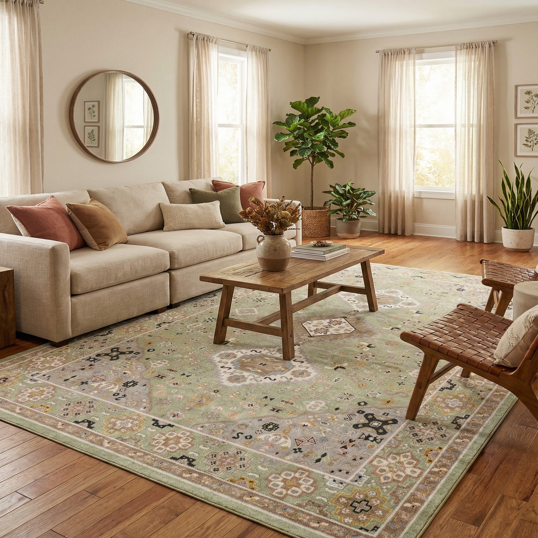 Primary color is Light Green. Colors in this rug include: Light Green, Beige, Black, Gray, Ivory, Pink, Light Blue.
