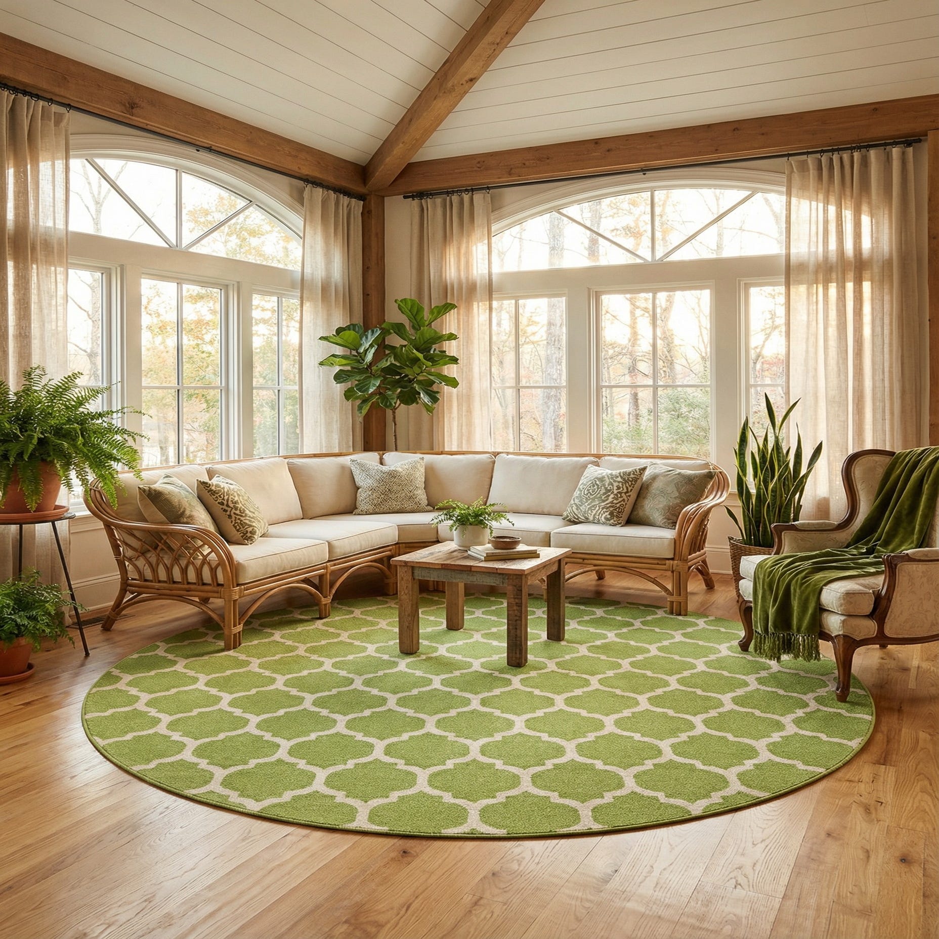 This round shape works beautifully beneath a dining table or as a focal layer in a sunroom, breakfast nook, or casual living area. Pair it with white or natural wood furnishings and neutral linens for a fresh, modern look, or add deeper green accents and metallic finishes for more contrast. The material and construction suit busy family spaces and high-traffic rooms where you want lasting color and pattern without excess maintenance.