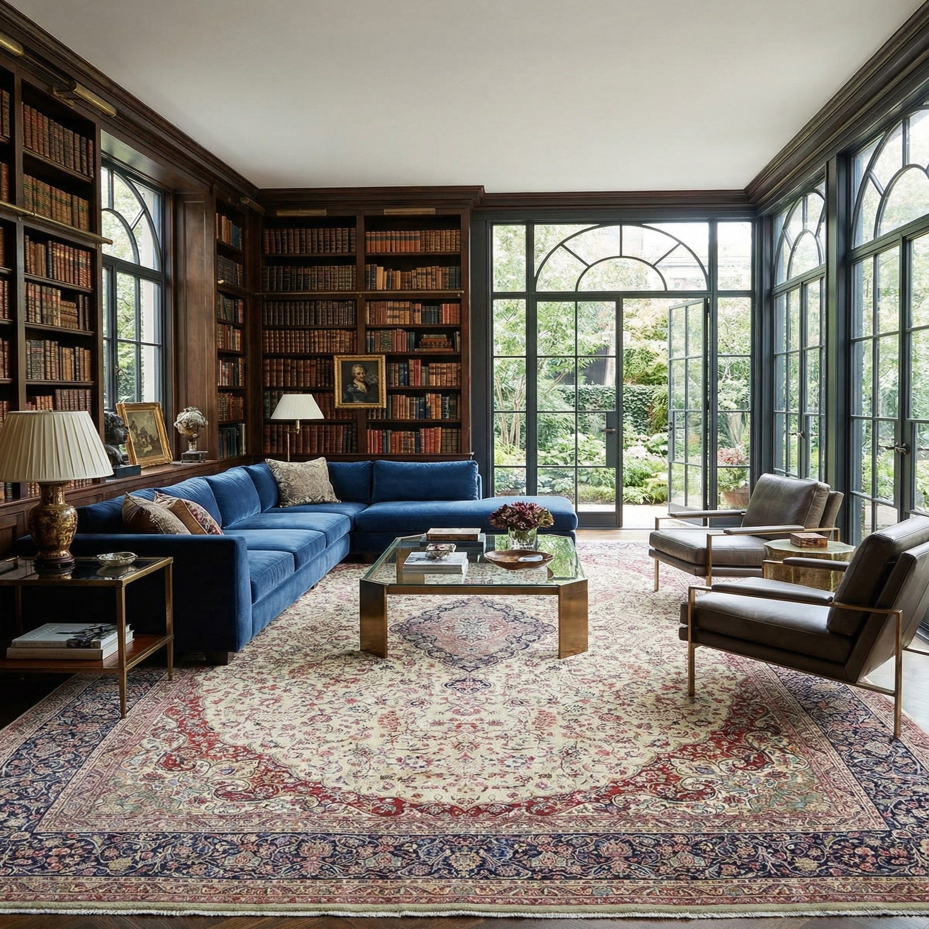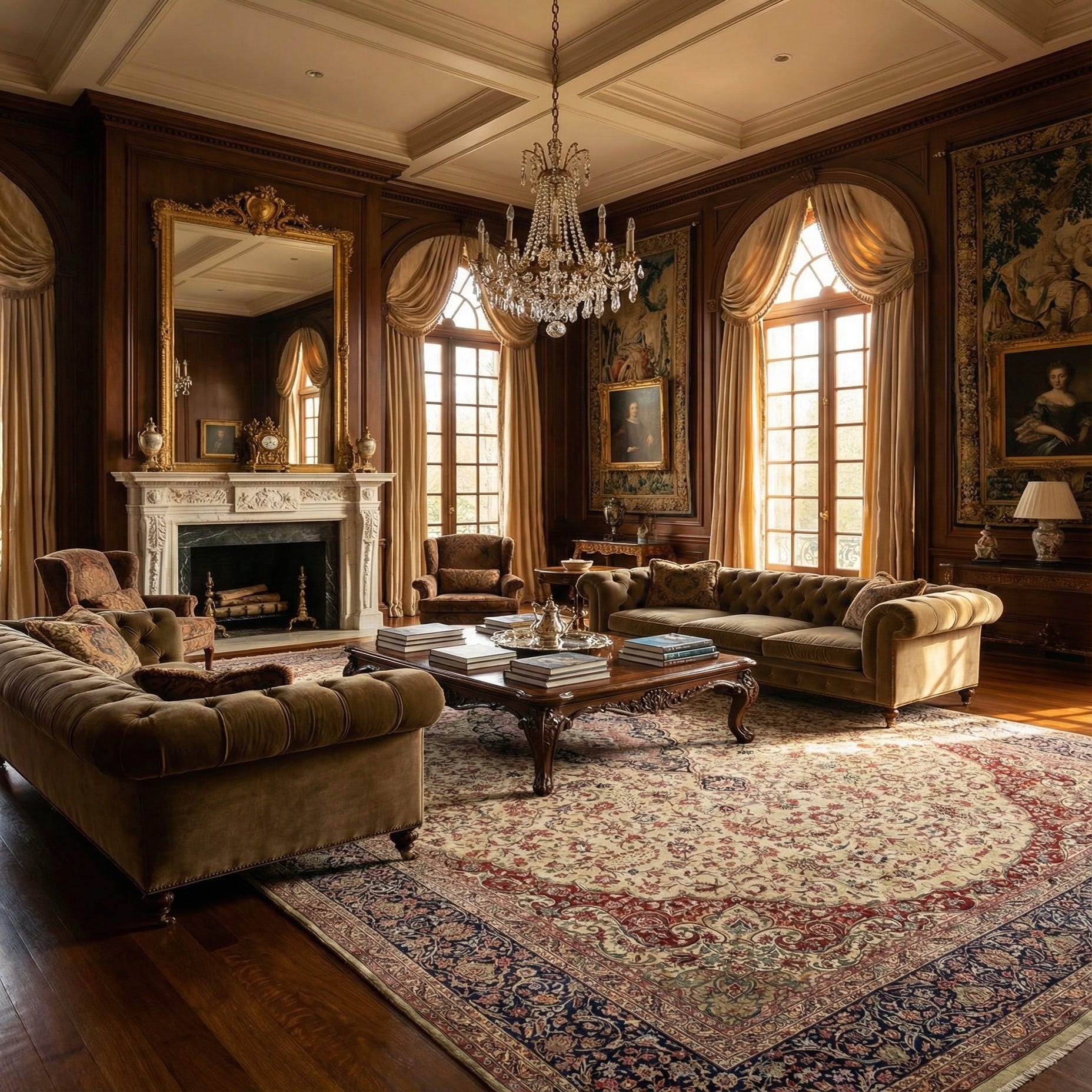 Given its classic patterning and rich yet subtle color palette, this piece harmoniously blends with interiors that echo old-world charm or those seeking a touch of historical elegance. It would serve as a stunning focal point in a grand living room, a stately dining area, or beneath a master bed in a spacious bedroom. This rug is well-suited to spaces adorned with antique furnishings, regal wood accents, or period features, grounding the décor and completing the ambience with its authentic heritage allure.