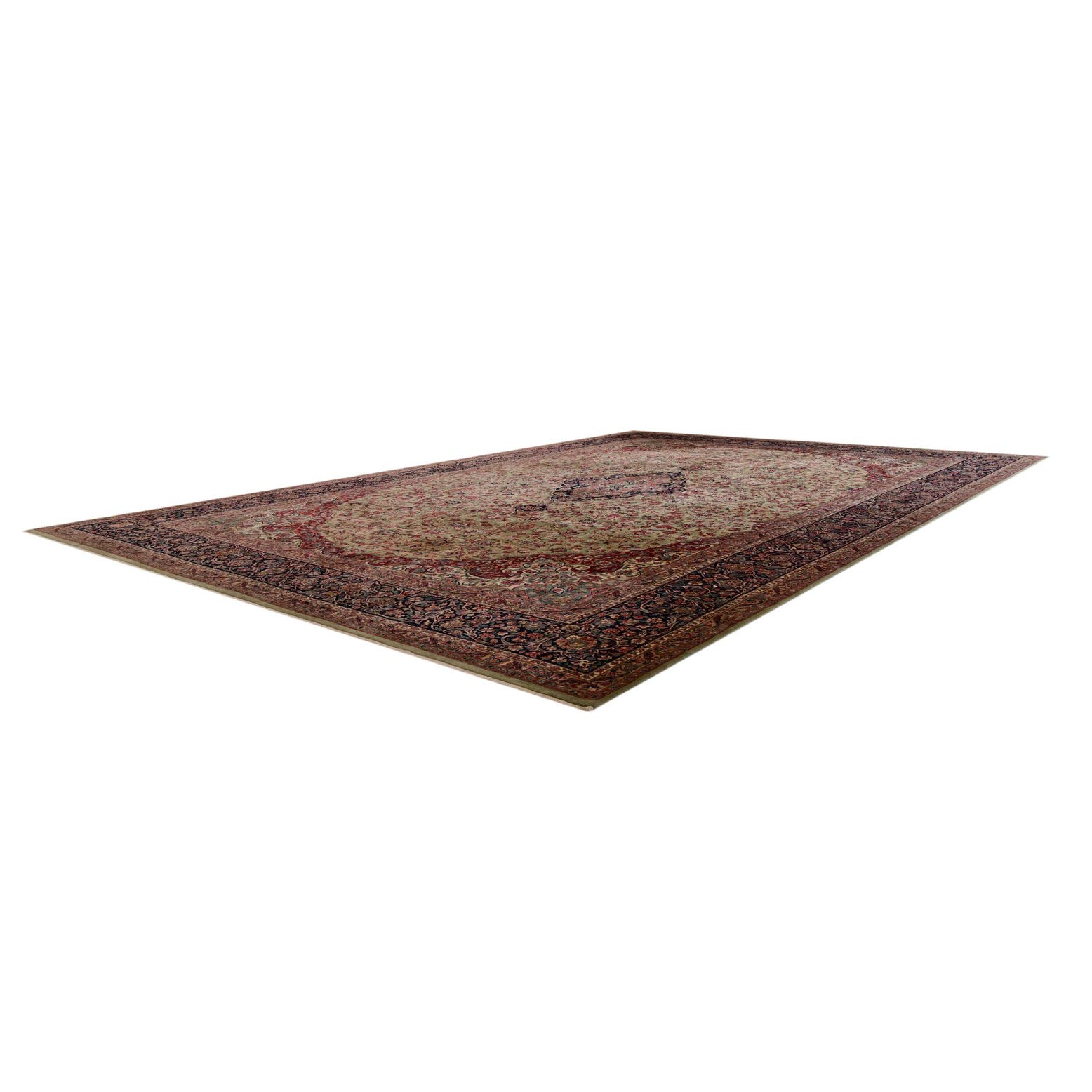 The Kerman collection presents a meticulously hand-knotted rug featuring a display of traditional sophistication. Crafted from 100% Kork, this 13x18 piece offers a dense, soft pile that provides a delightful underfoot experience. The rug showcases a complex pattern predominantly in a light green background, which is elegantly punctured by an array of floral and intricate motifs in shades of blue, green, navy blue, olive, peach, red, and puce. The detailed border frames the central design, creating a sense of structure and formality.