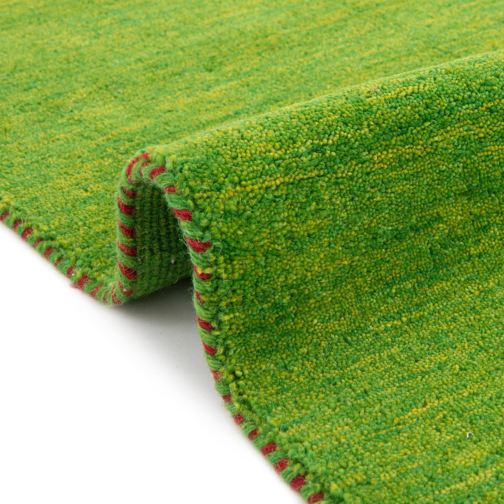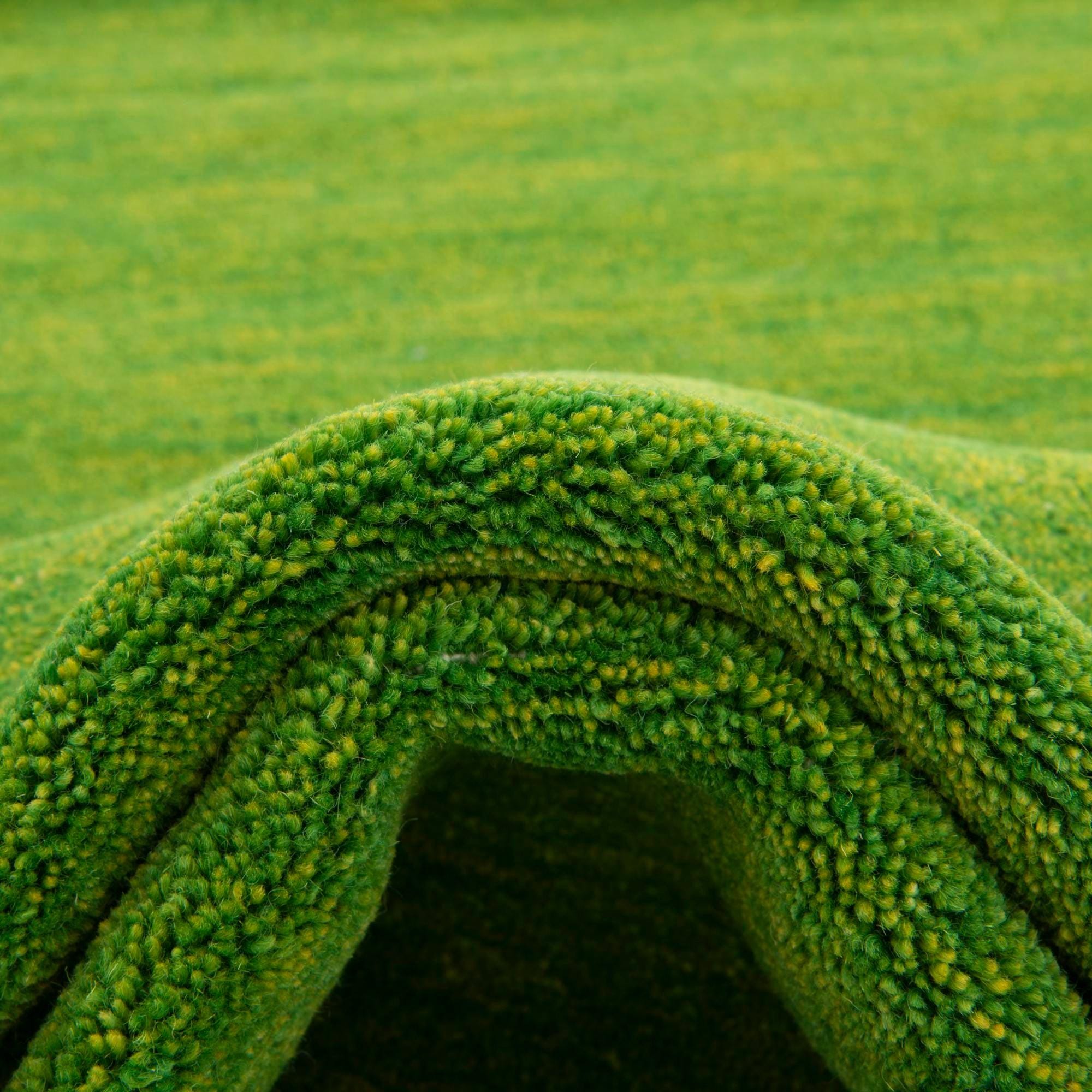A single-field runner in fresh light green with subtle tonal variations, this hand-knotted wool rug presents a clean, minimalist surface with a soft, heathered texture. The solid field is enlivened by gentle shifts in green that create depth and movement without a defined pattern, while the natural wool pile has a low sheen and a dense, cushiony feel underfoot. Hand-knotted construction and 100% wool give the surface a tactile warmth and slight irregularities along the edges that reflect its handcrafted nature.