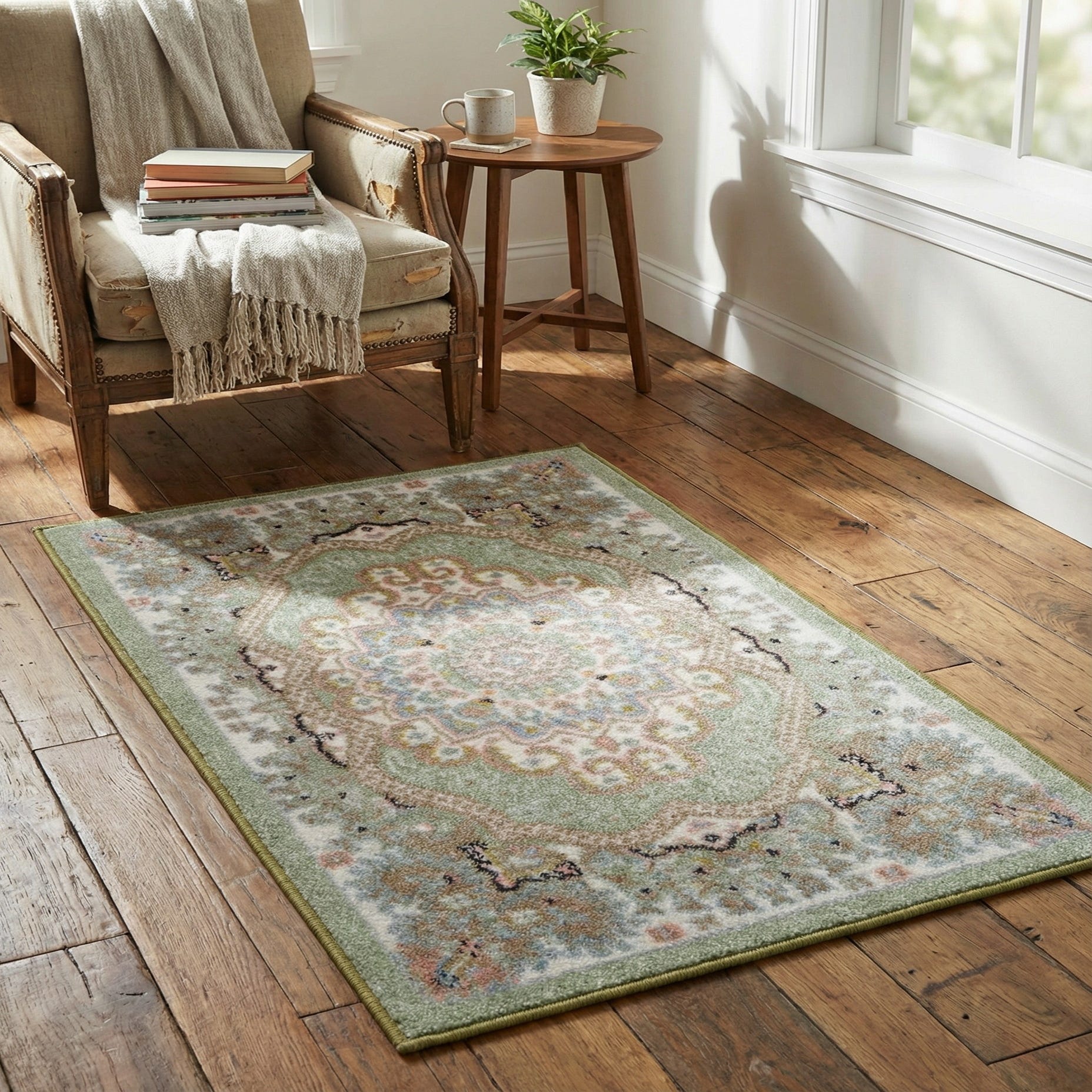 Primary color is Light Green. Colors in this rug include: Light Green, Beige, Ivory, Light Blue, Pink.
