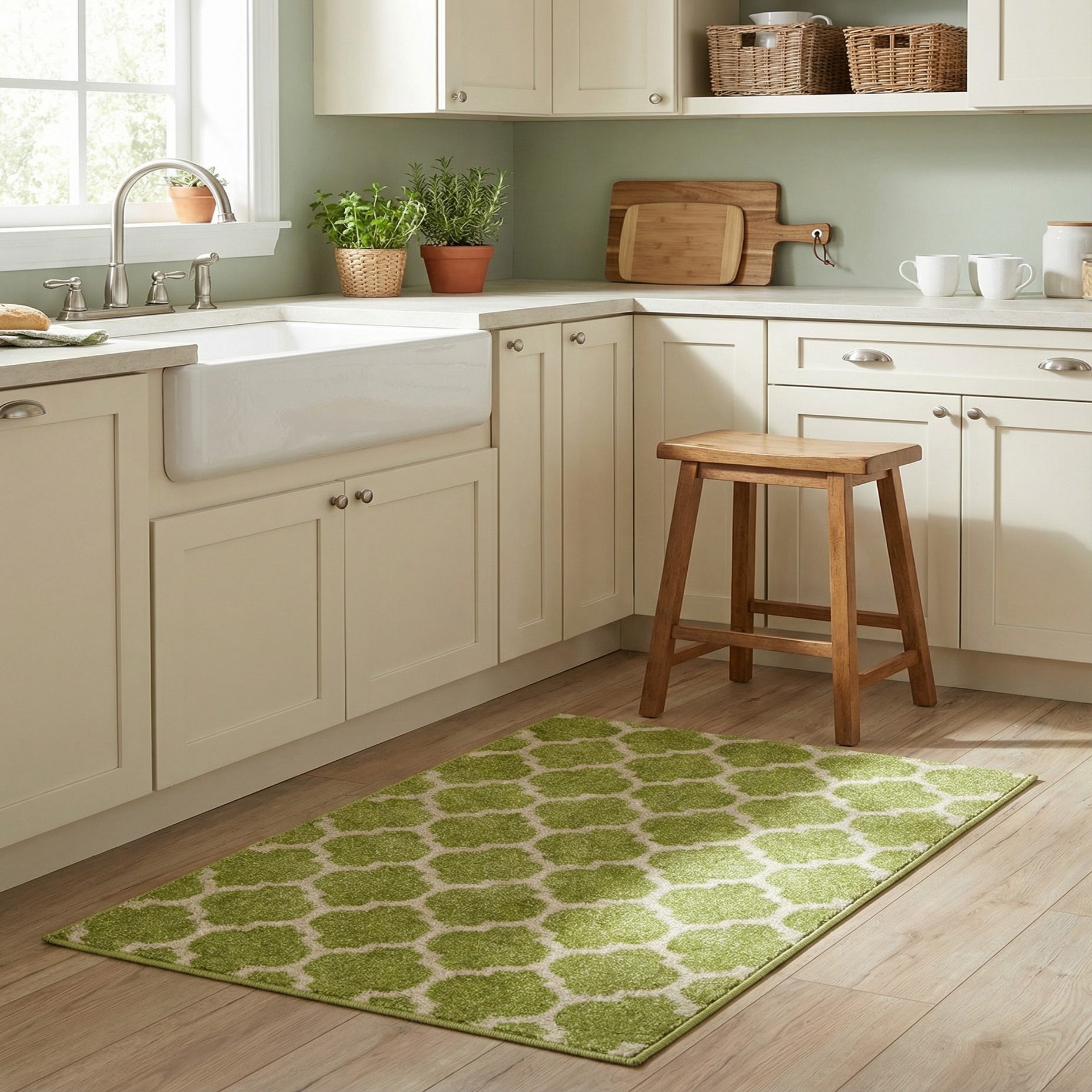 A 2x3 rectangular green and cream trellis pattern rug with a medium pile, perfect for an entryway.
