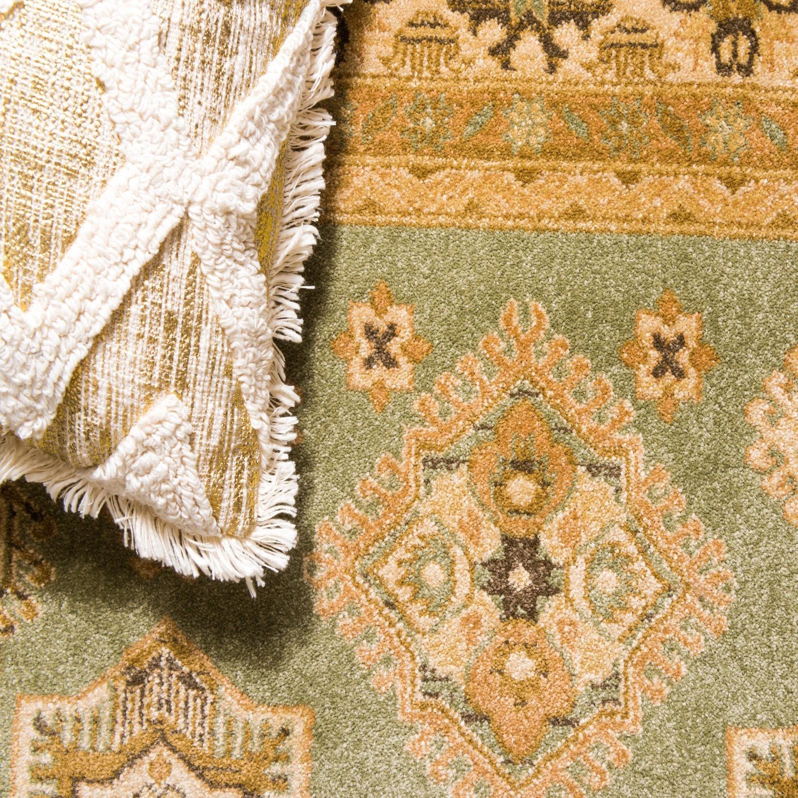 Primary color is Light Green. Colors in this rug include: Light Green, Beige, Cream, Brown.