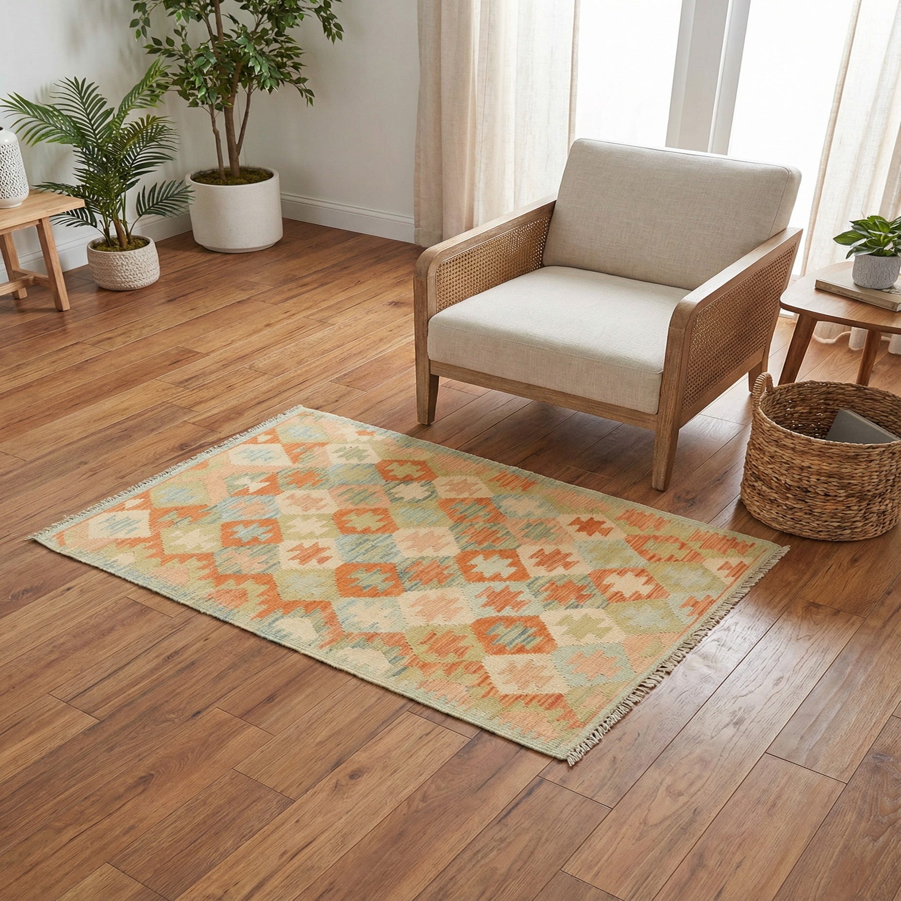 The Kilim Waziri rug is a handwoven 3x4 piece crafted from 100% wool, known for its durability and comfort underfoot. This rug presents a harmonious blend of Light Green as its background color, with patterns accentuated by hues of Blue, Olive, Orange, and Beige. This combination renders a vibrant yet soothing palette that can energize a room while maintaining an air of calm.