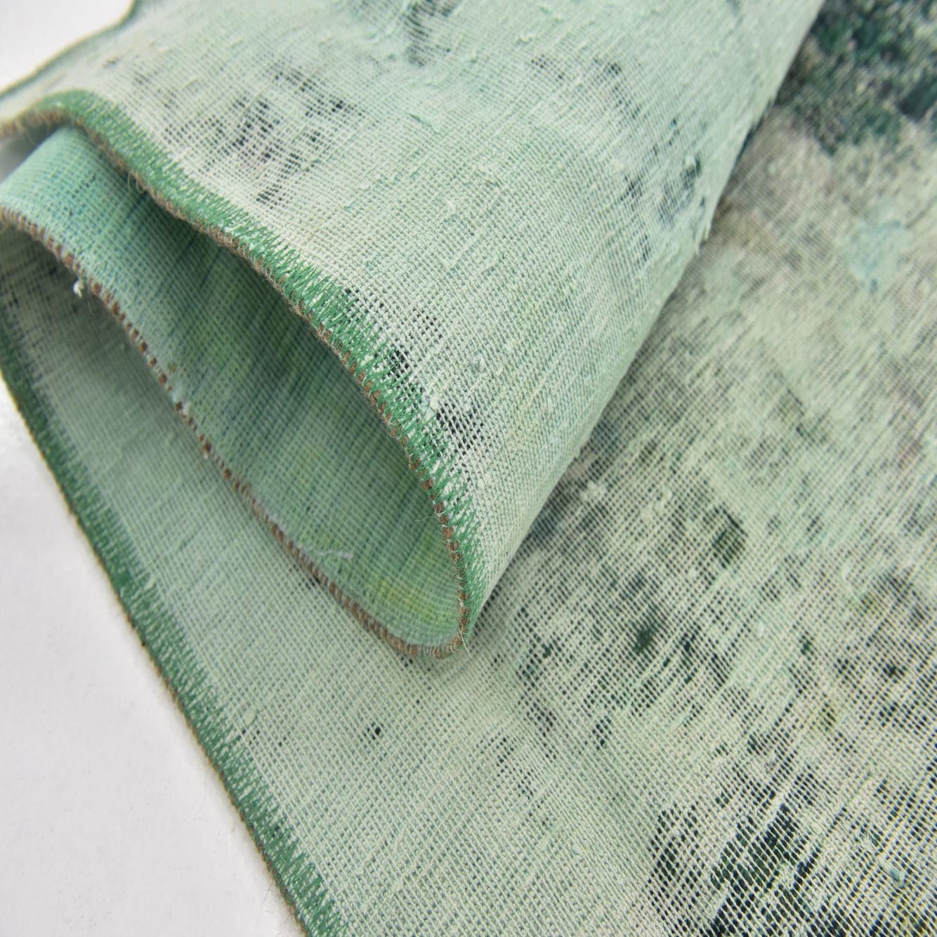 A soft light green field provides a calm backdrop for painterly sweeps of hunter green that form an abstract, distressed composition. Irregular patches, faint striations and open areas create a vintage-inspired, worn effect that reads like a softly weathered canvas. Hand-knotted of 100% wool, the rug has a low-profile, dense surface that feels warm and pleasantly cushioned underfoot; running your hand across it reveals subtle variations in pile and tone where the knotting gives the piece a handcrafted texture.
