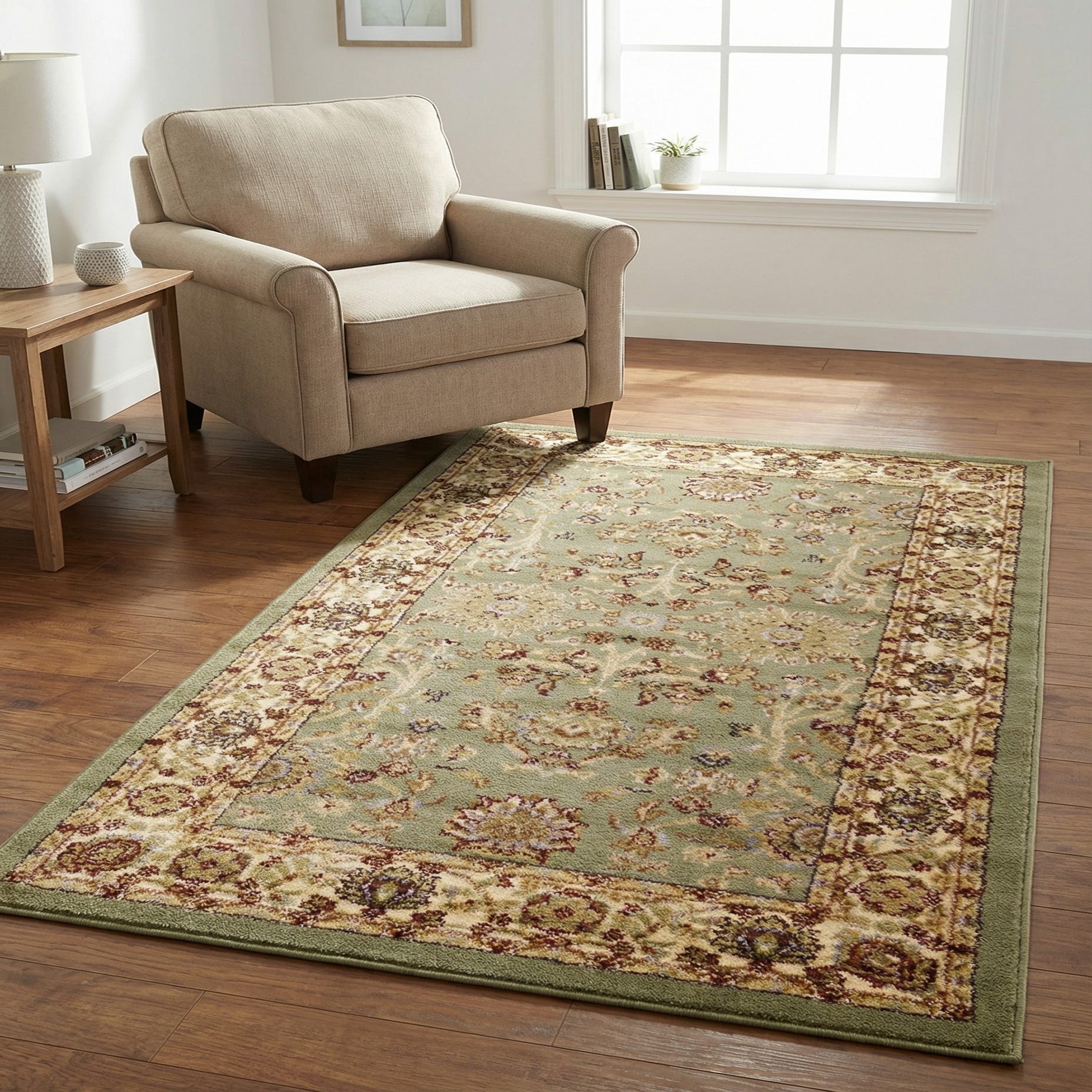 A traditional medallion and vine pattern spreads across a light green ground, surrounded by a cream floral border that brings structure to the overall design. Light blue, cream, tan, gold, red and rust-red accents are woven through the motifs, adding layered warmth and subtle contrast against the soft green background. Machine-made from 100% polypropylene, the rug has a low, dense pile that feels smooth underfoot while maintaining clear pattern definition and a consistent surface.