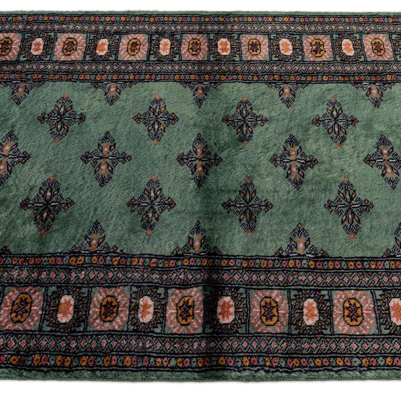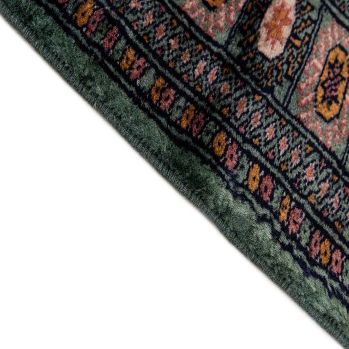 A 3x5 rectangular Bokhara rug in shades of green with a traditional tribal pattern and fringe.