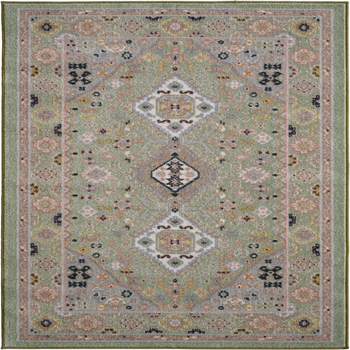 Primary color is Light Green. Colors in this rug include: Light Green, Black, Ivory, Light Blue, Pink, Gray.