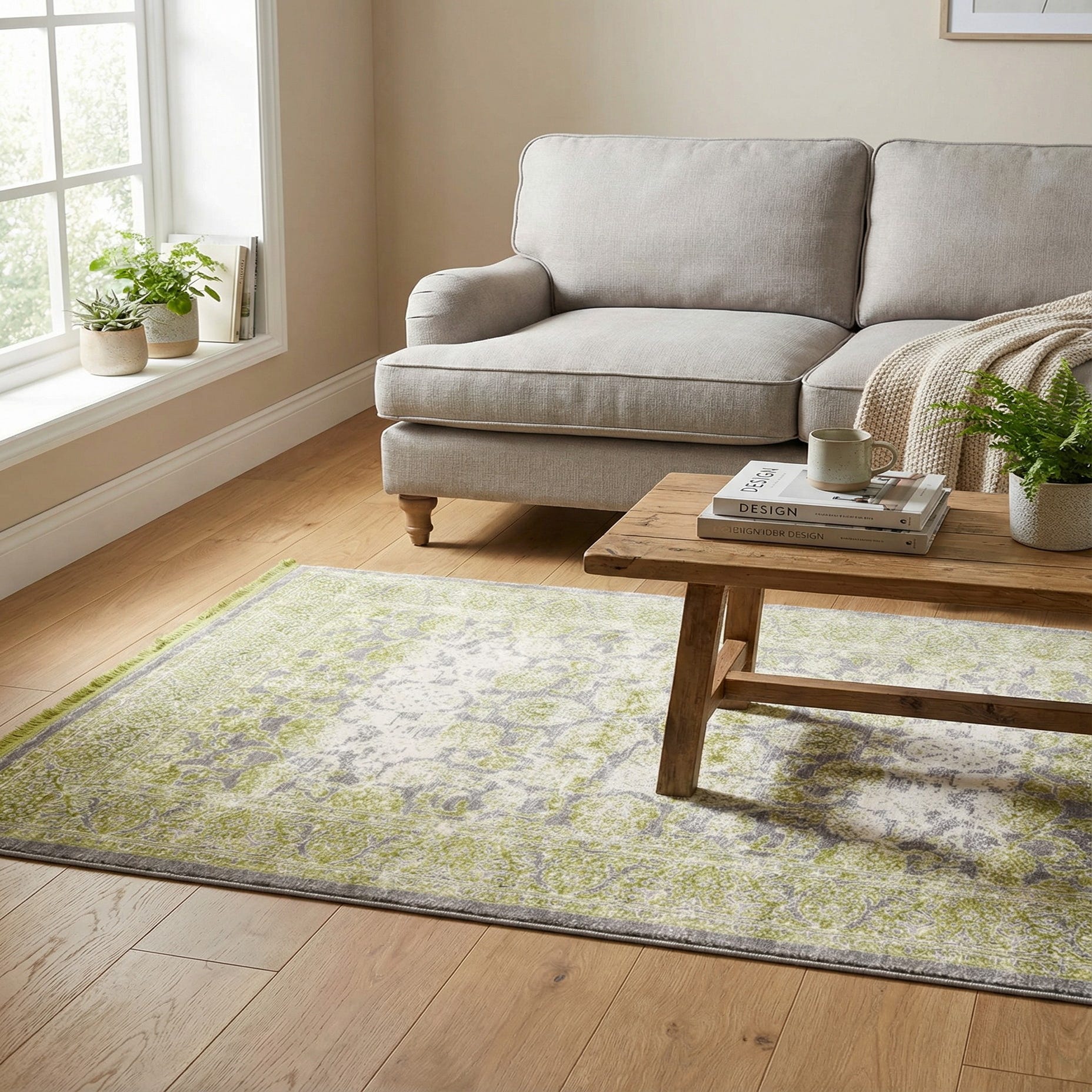 A softened classical medallion and floral arabesque pattern sits on a light green background, with gray and ivory motifs that add depth and a gently worn, antique-inspired look. Narrow guard borders and an outer floral border frame the central field, and short, tonal fringe finishes the ends. The low-profile pile has a smooth, slightly plush hand and a subtle sheen from the blended yarns, so the pattern reads clearly without heavy texture.