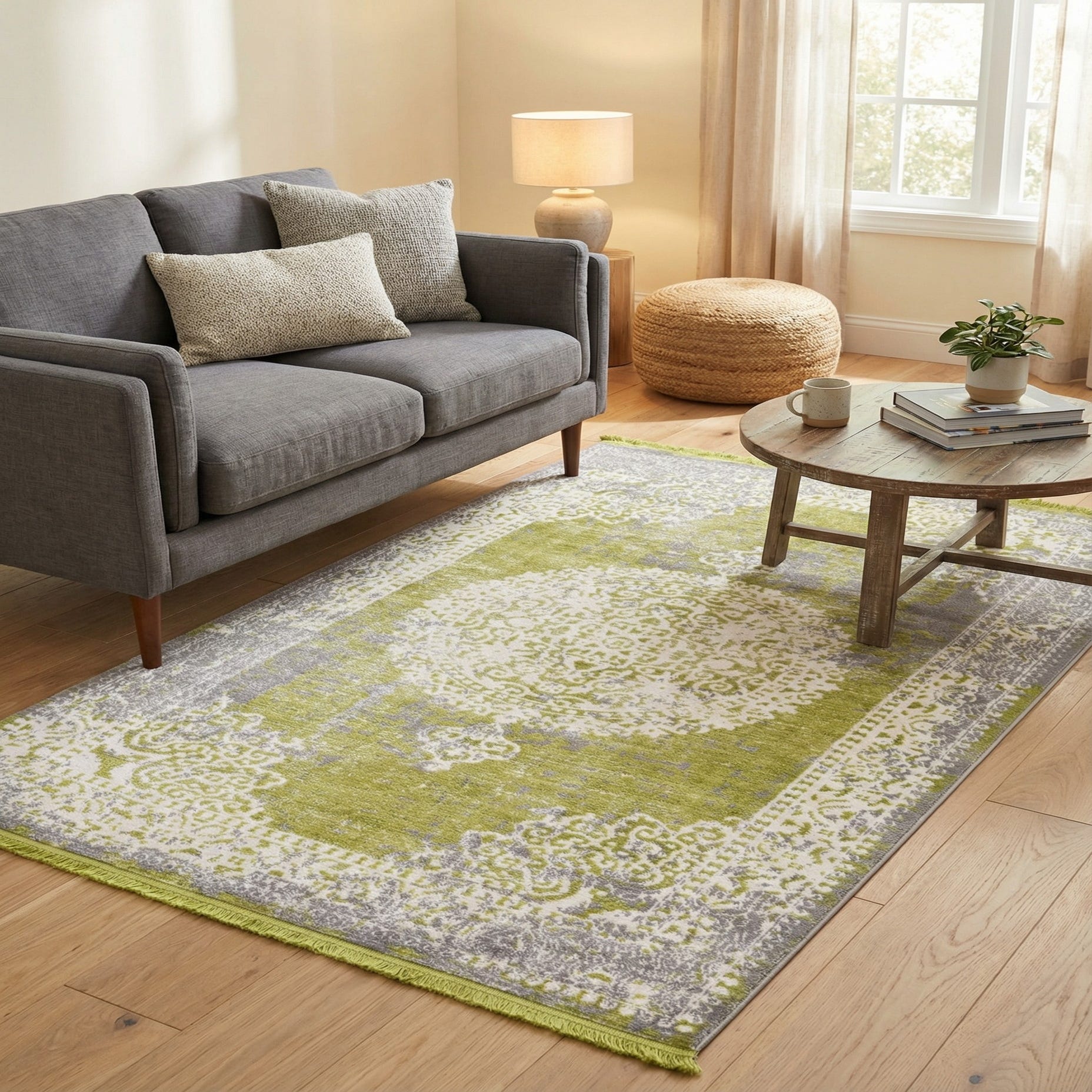 A soft, vintage-inspired medallion sits at the center of this rug, surrounded by an ornate border with gently distressed detailing. The background is light green, while gray and ivory motifs create layered contrast that highlights the classical pattern without feeling heavy. The surface has a low, dense pile with a soft hand—polyester adds a subtle sheen while polypropylene gives the weave a smooth, resilient feel—and the ends are finished with short, tonal fringe.