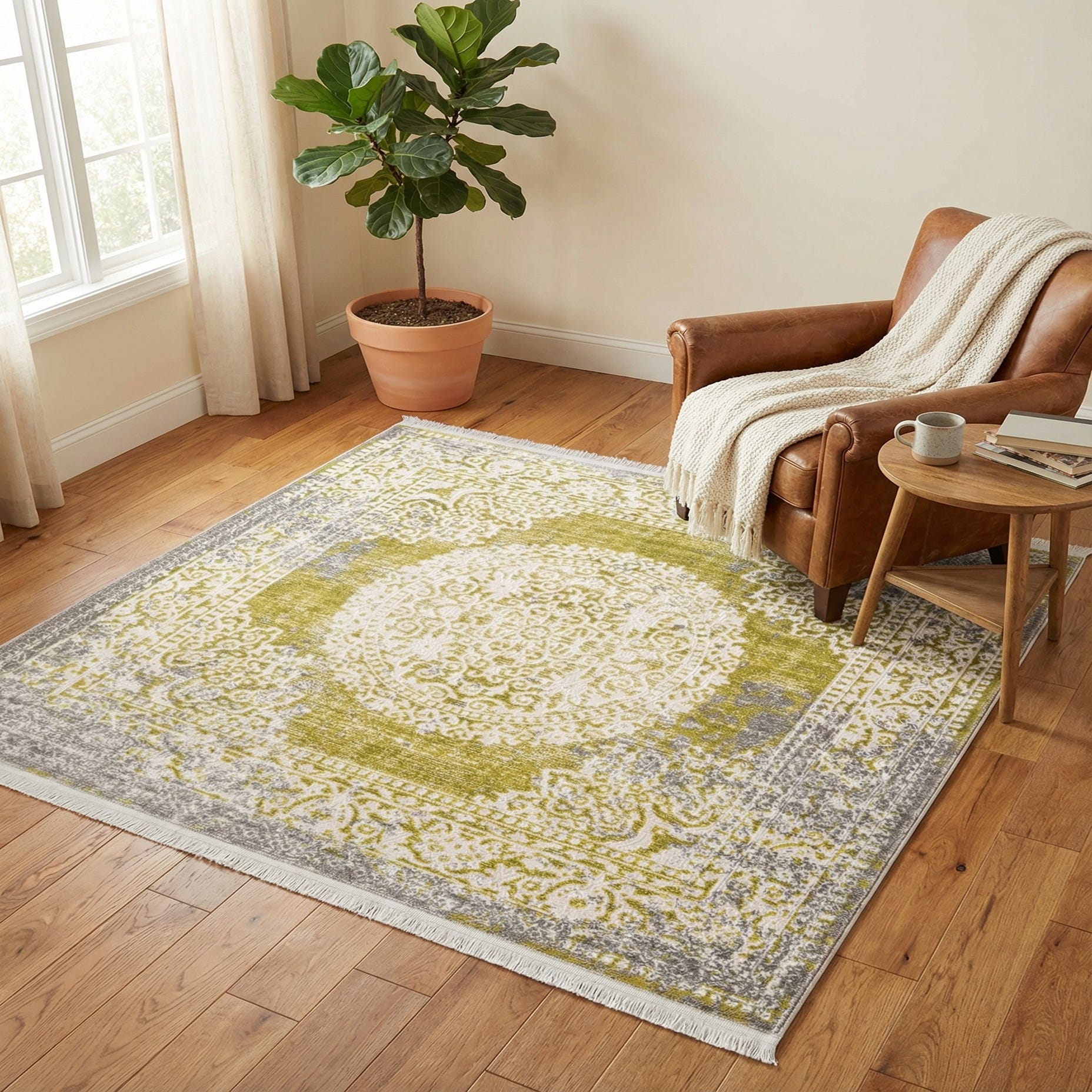 Place this piece to anchor a seating area or layer it over hardwood to add a splash of color without overwhelming the room. It pairs well with neutral upholstery and warm wood tones, and also complements transitional or contemporary interiors that want a hint of classical detail. Use it in a bright living room, a cozy reading nook, or beneath a small dining table to introduce pattern and light into the space.