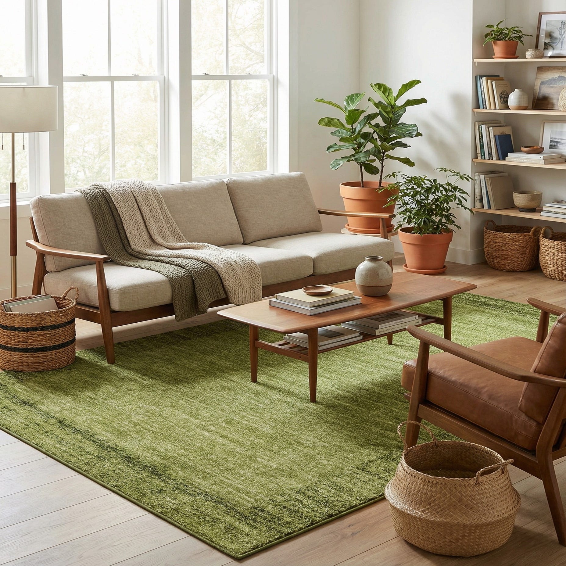 Machine made of 100% polypropylene, the rug combines a streamlined hand with everyday practicality. The calm green palette pairs naturally with warm wood finishes, ivory upholstery, and matte black or brass accents—an easy choice for a modern living room, a sunlit reading nook, a relaxed dining corner, or an entryway that benefits from a focused pop of color. Place it to ground a small seating arrangement or layer it over neutral flooring to introduce a fresh, nature-inspired note to the room.