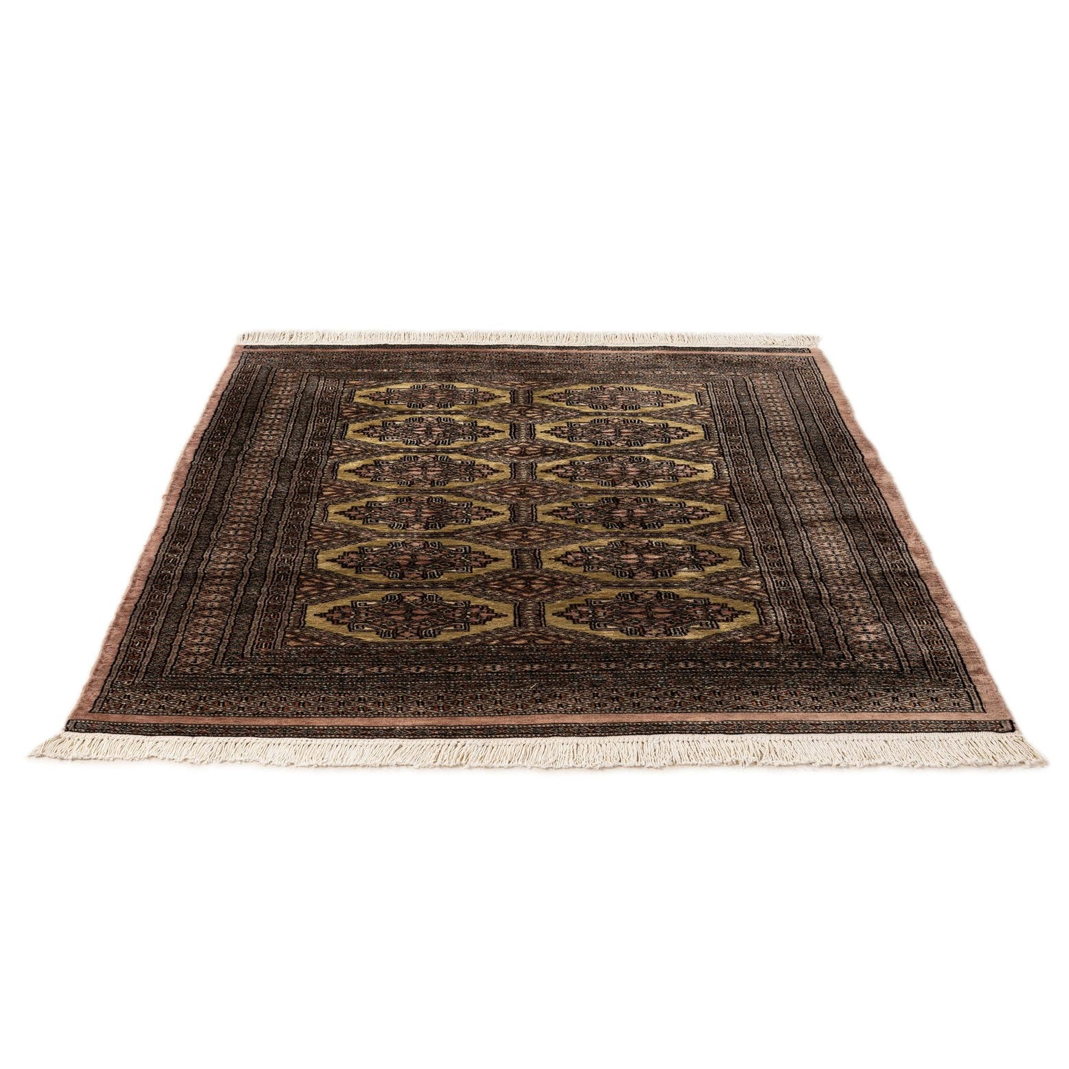 A 4x6 rectangular green and brown Bokhara rug with a traditional tribal pattern and fringe ends.