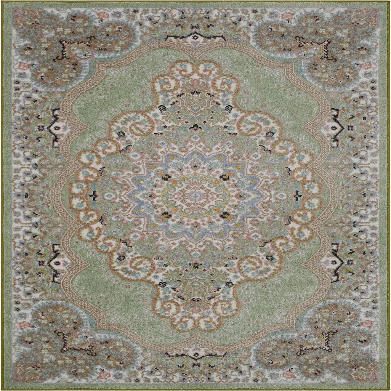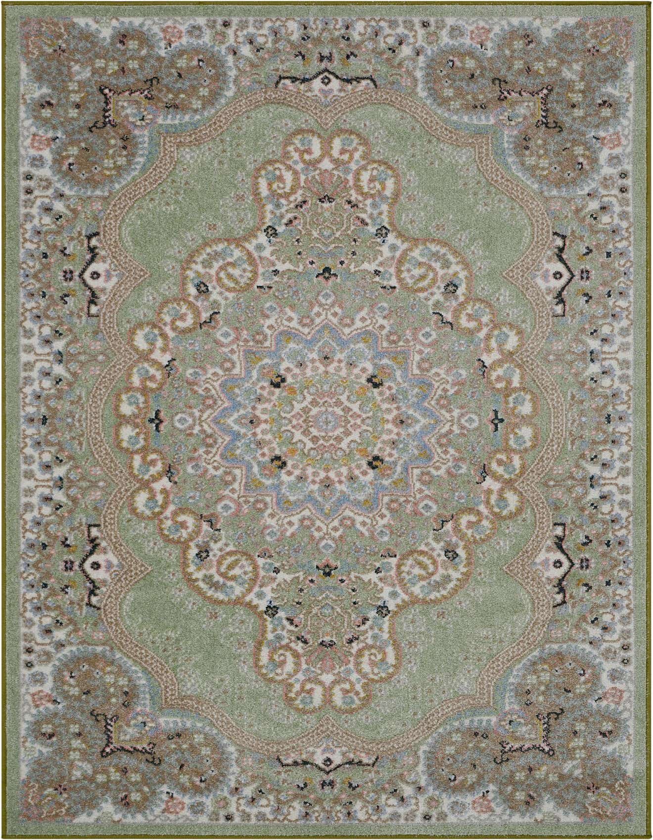 Primary color is Light Green. Colors in this rug include: Light Green, Beige, Ivory, Light Blue, Pink.