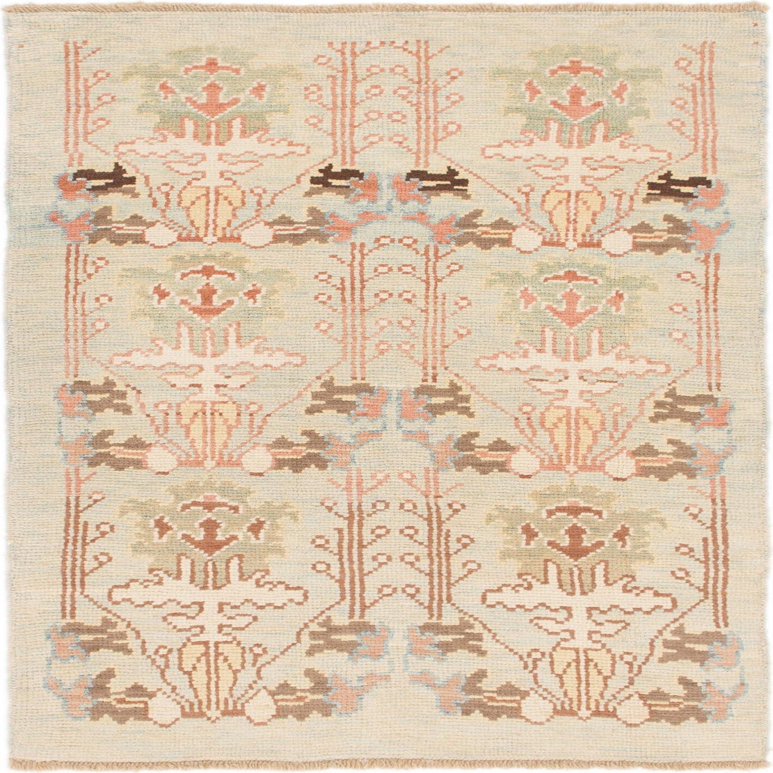 A 4x6 rectangular Oushak rug with a tribal abstract pattern in greens, pinks, and browns on a light background.