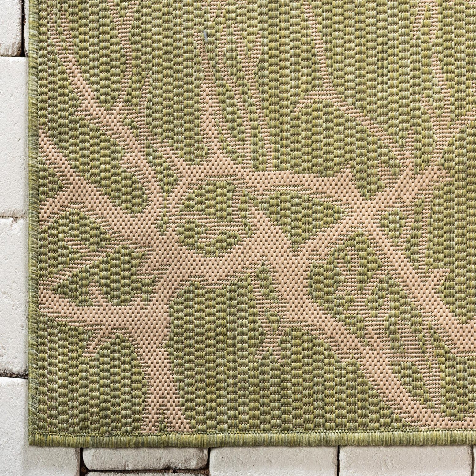 A 4x6 rectangular green indoor/outdoor rug with a light beige botanical coral or branch pattern, flatweave texture.