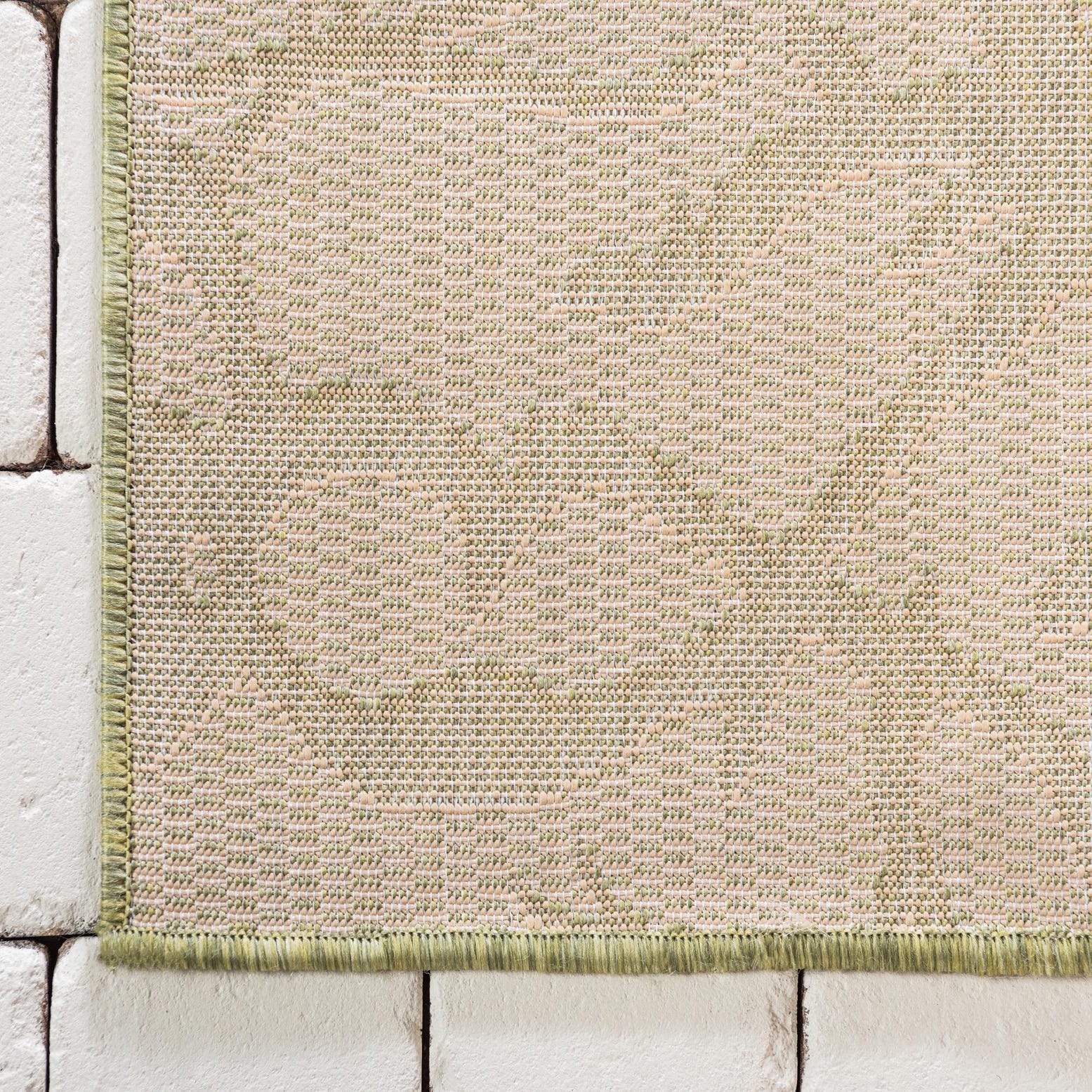 Machine-made from 100% polypropylene, this outdoor rug has a low-profile, tightly woven surface that feels sturdy underfoot with a subtle ribbed texture. The light green background sets a fresh, natural stage for a beige botanical design of meandering branches and delicate twigs. The organic pattern flows across the surface, offering visual depth without overwhelming the space, while the smooth, flat construction makes the motif easy to appreciate up close.