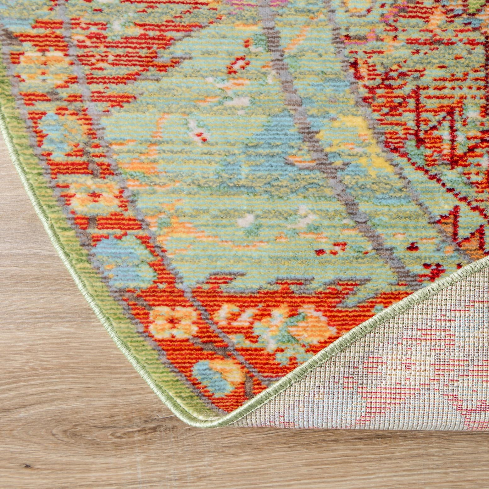 The mix of traditional motifs and contemporary color gives this piece versatile appeal. It works well beneath a round bistro or dining table to define a breakfast nook, as a color anchor in a casual living room layered with neutral seating, or in an entry or sunroom to introduce pattern and warmth. Pair it with light wood or painted furnishings, woven baskets and soft linens for a relaxed, collected atmosphere that balances classic pattern with modern color.