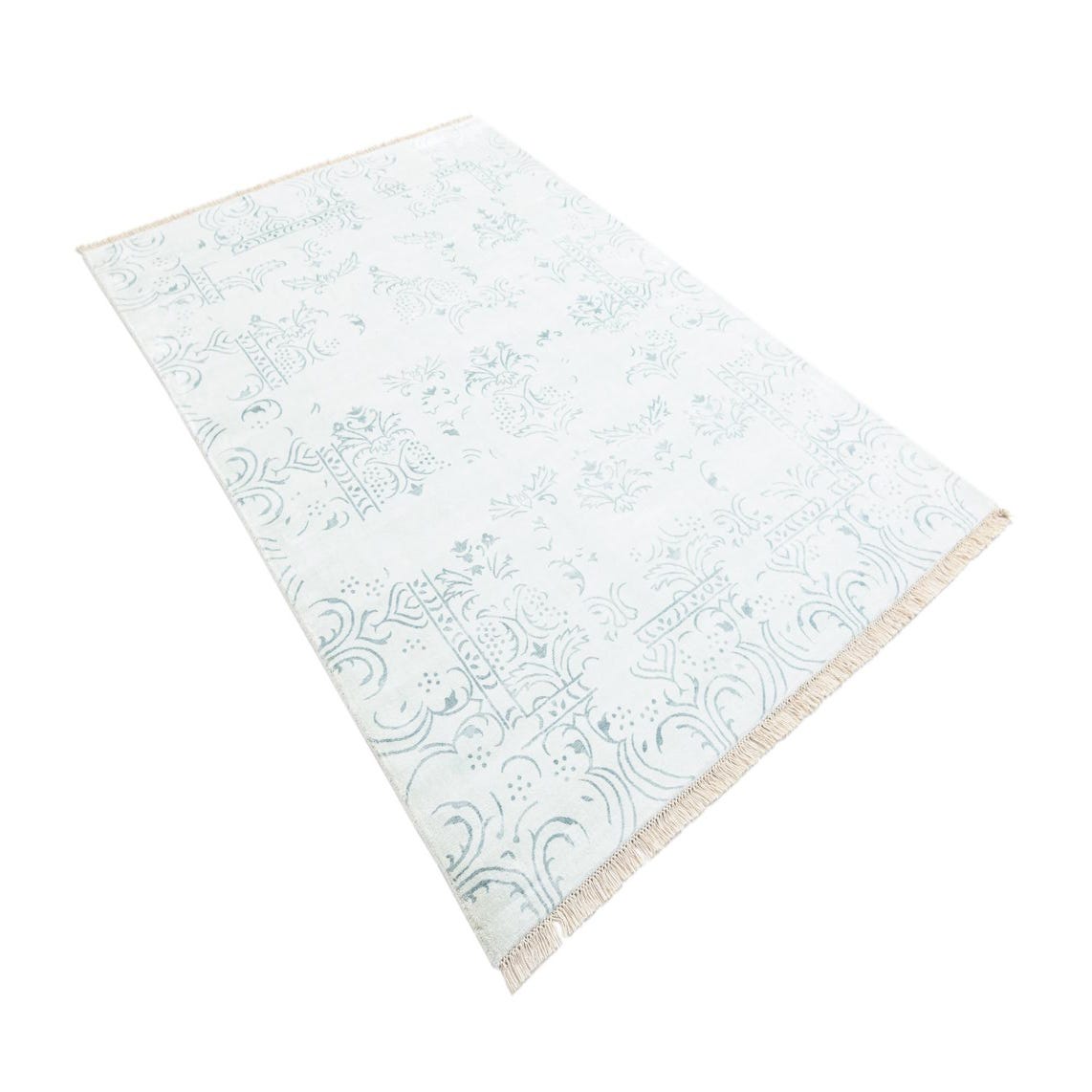 A 5x8 rectangular Darya Collection rug in light green with a subtle modern floral and scroll pattern, featuring fringed ends.