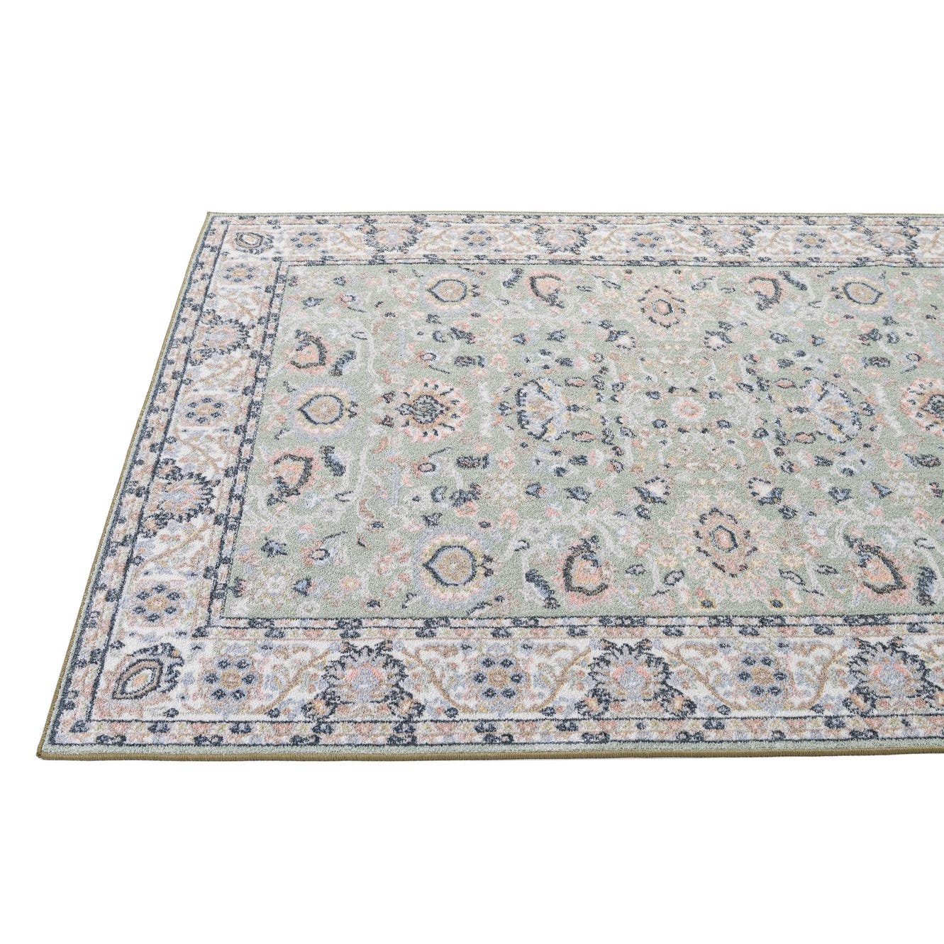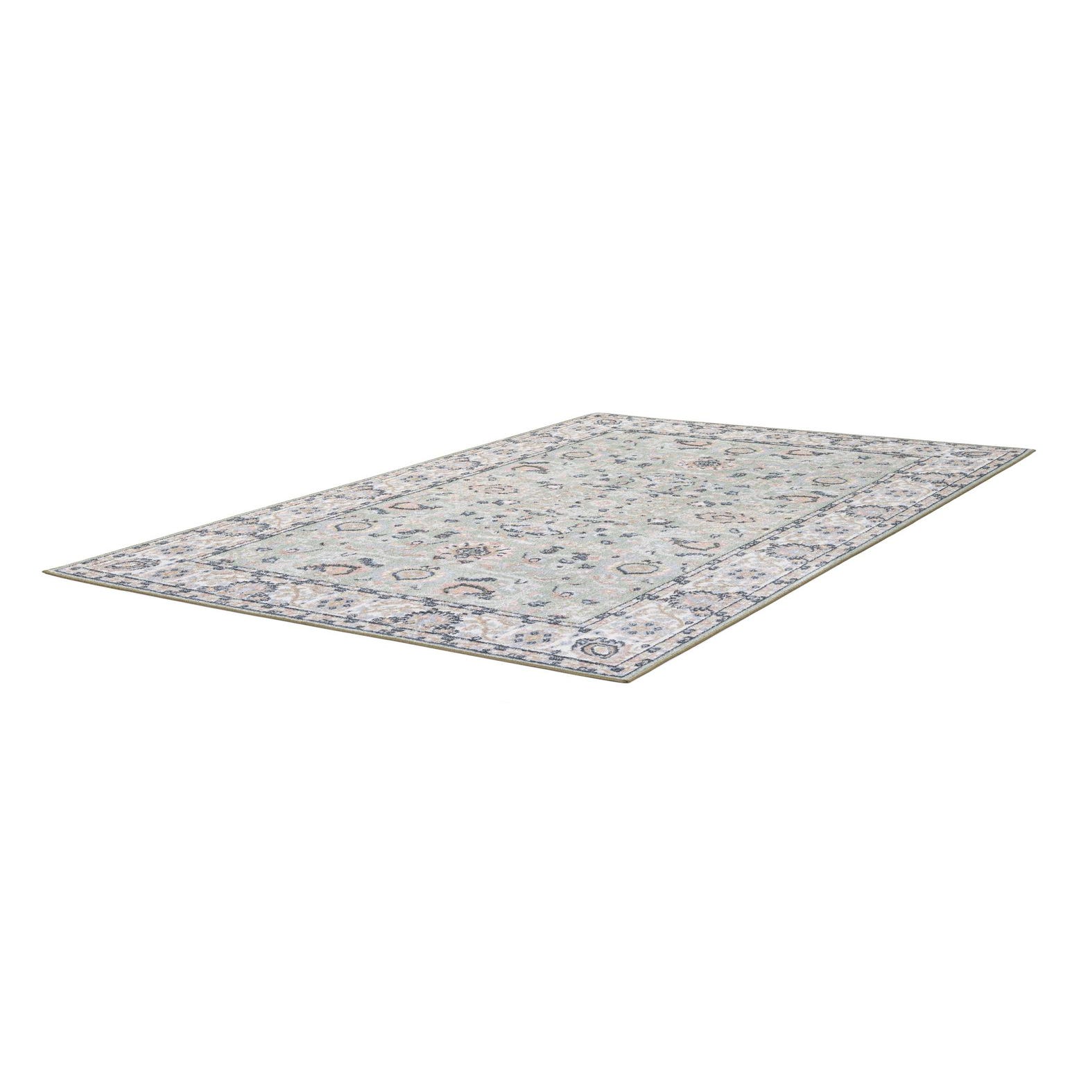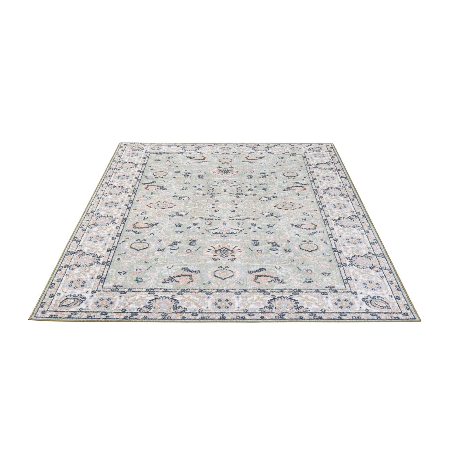 A 5x8 rectangular Kamala Washable rug in light green with a vintage Oriental pattern, featuring a detailed border in cream, pink, and navy.