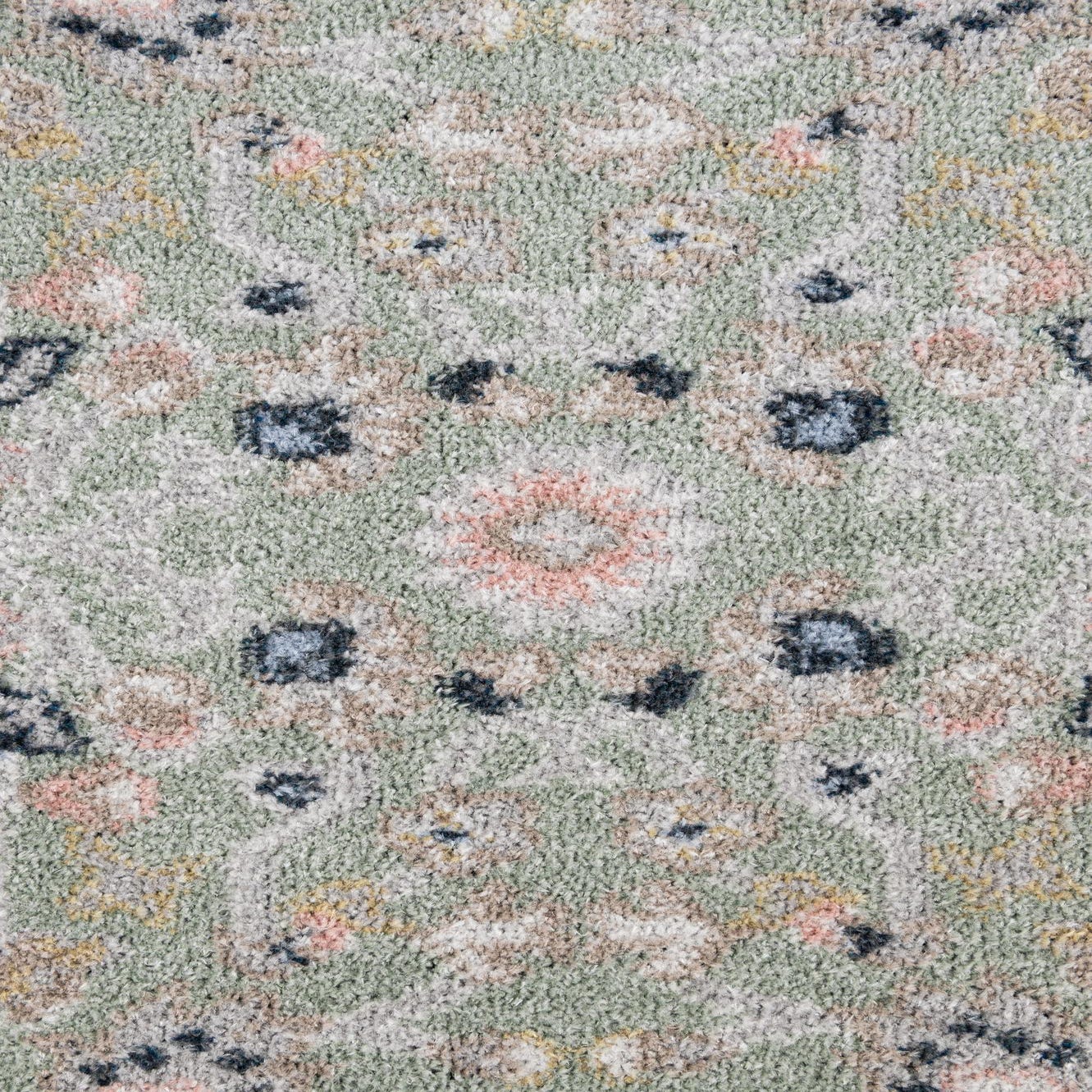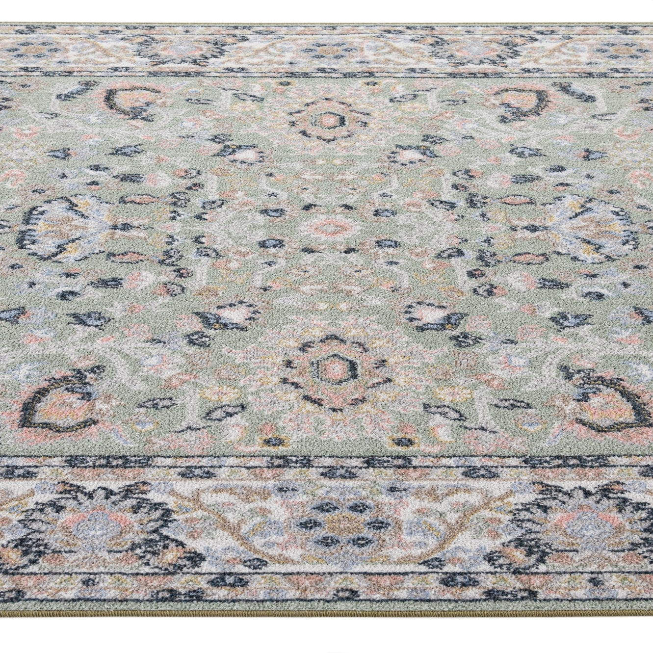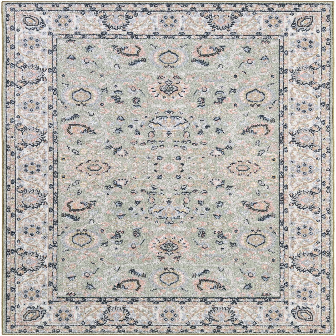 Primary color is Light Green. Colors in this rug include: Light Green, Ivory, Navy Blue, Gray.