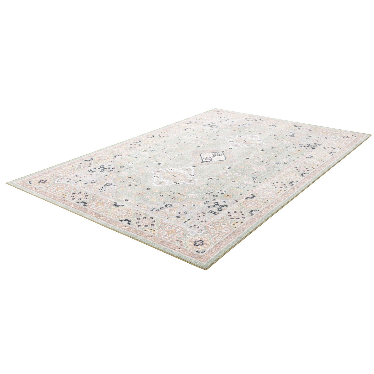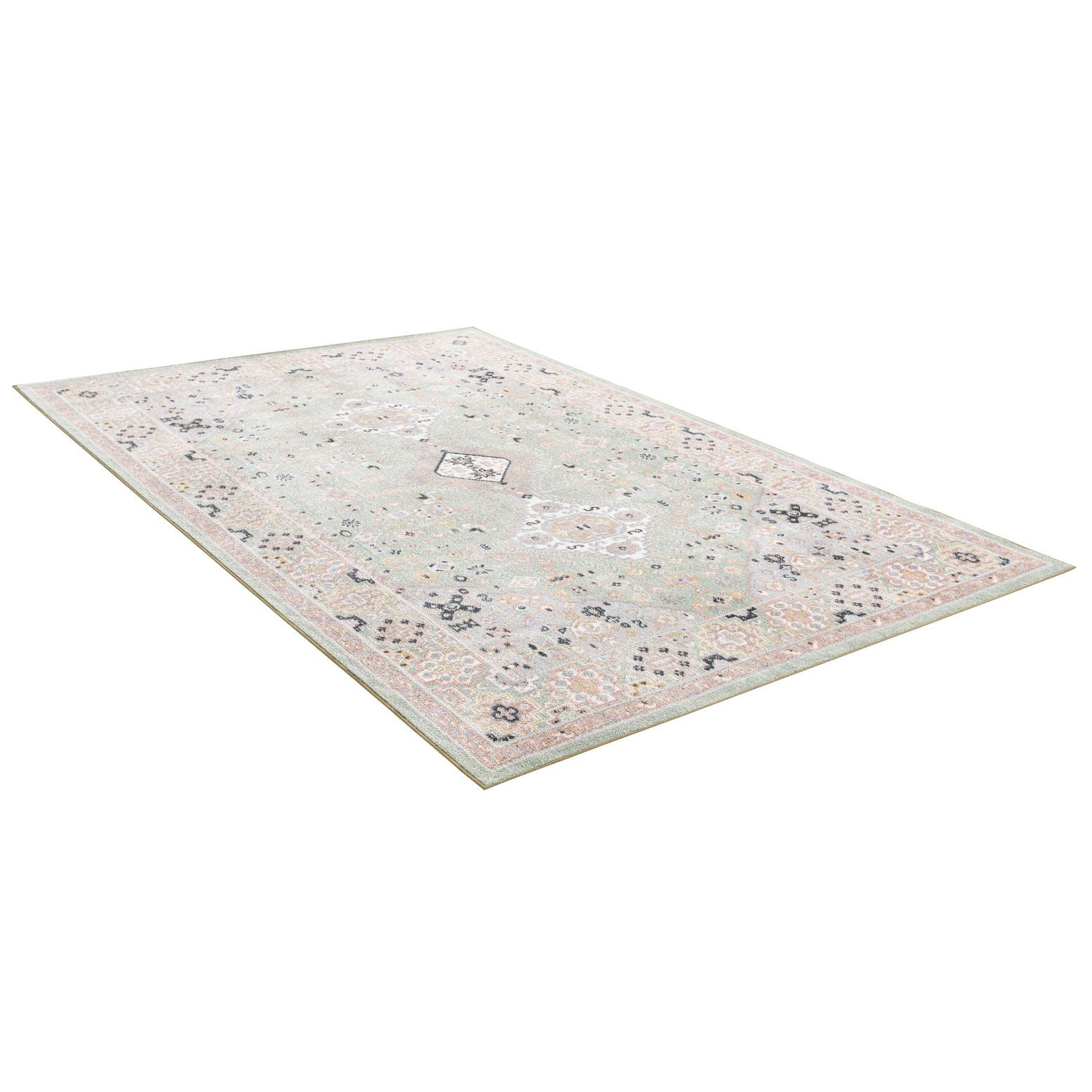 Primary color is Light Green. Colors in this rug include: Light Green, Beige, Black, Gray, Ivory, Pink, Light Blue.