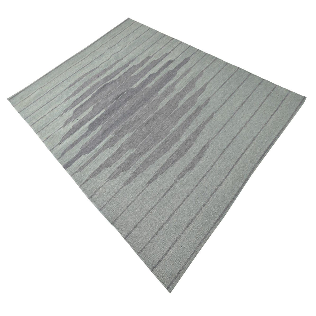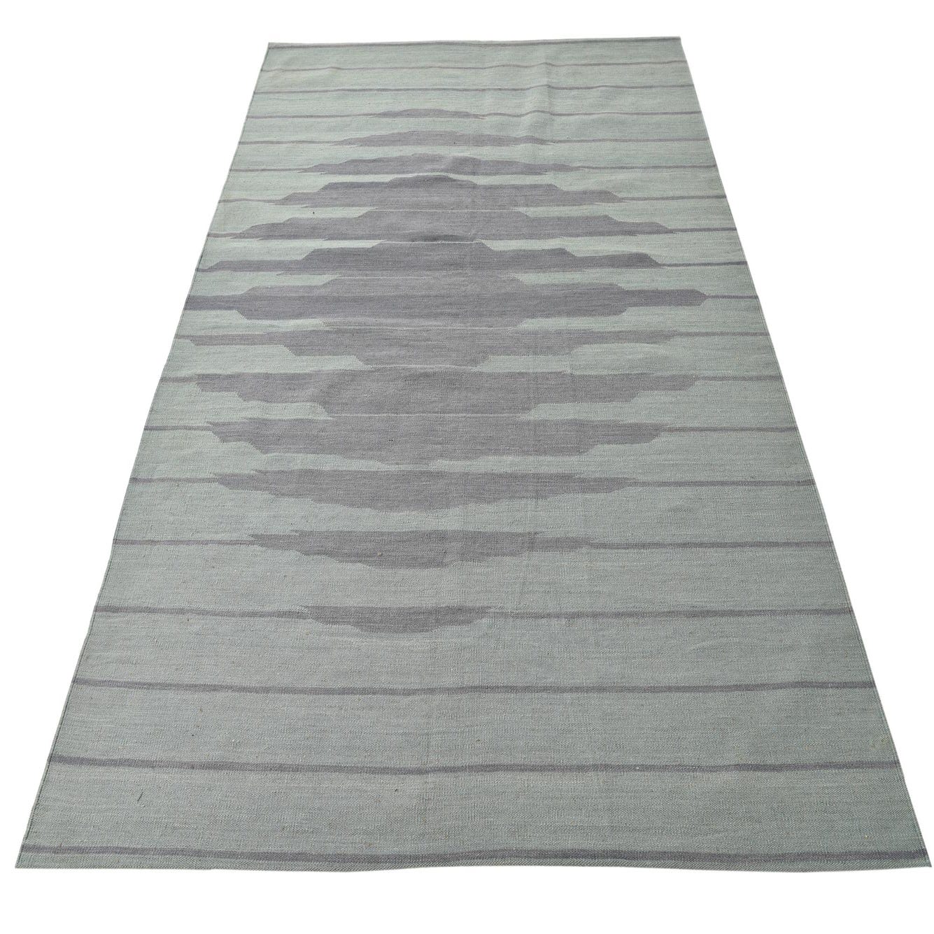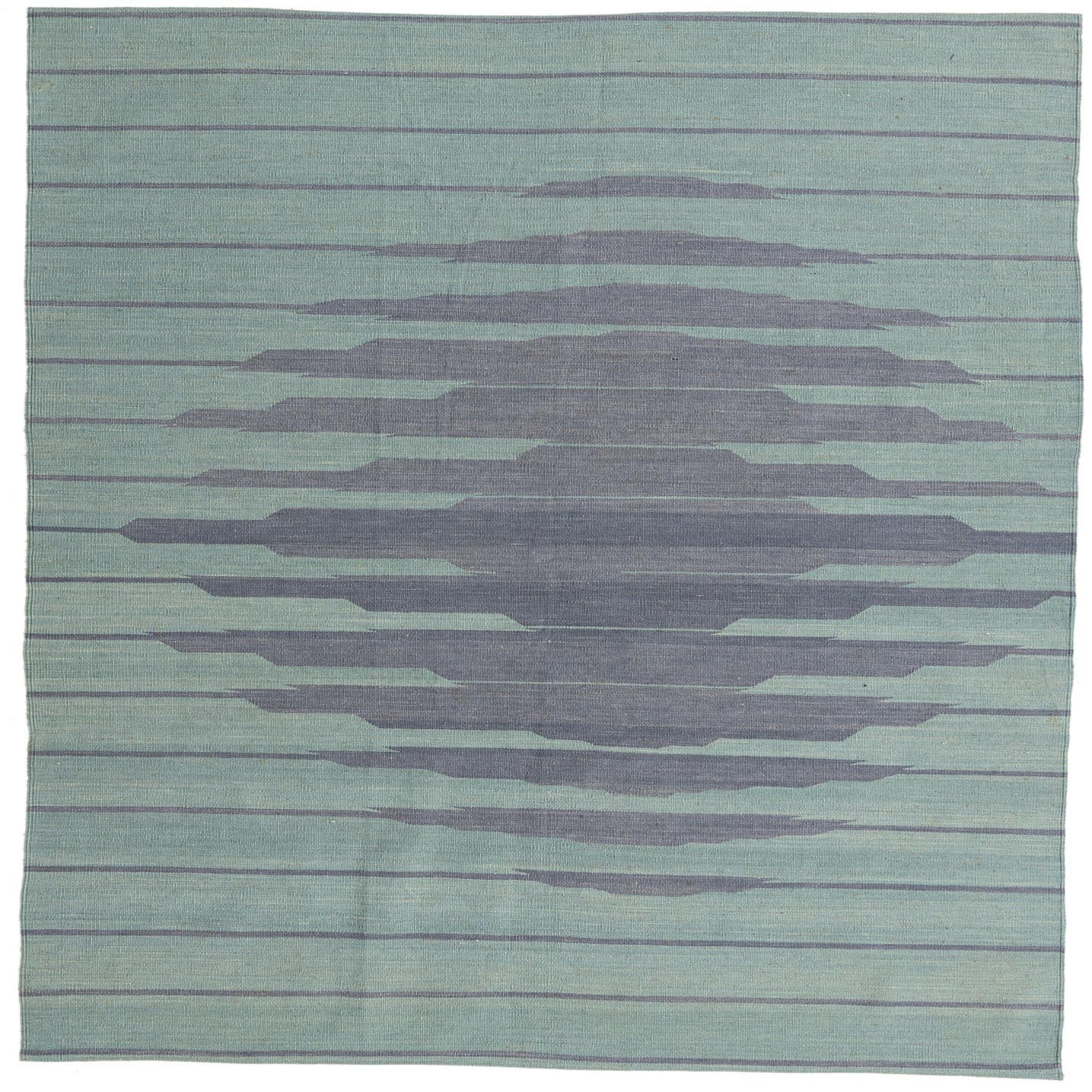 A 5x8 rectangular green flatweave wool rug featuring a modern tribal stripe pattern with a central diamond shape.
