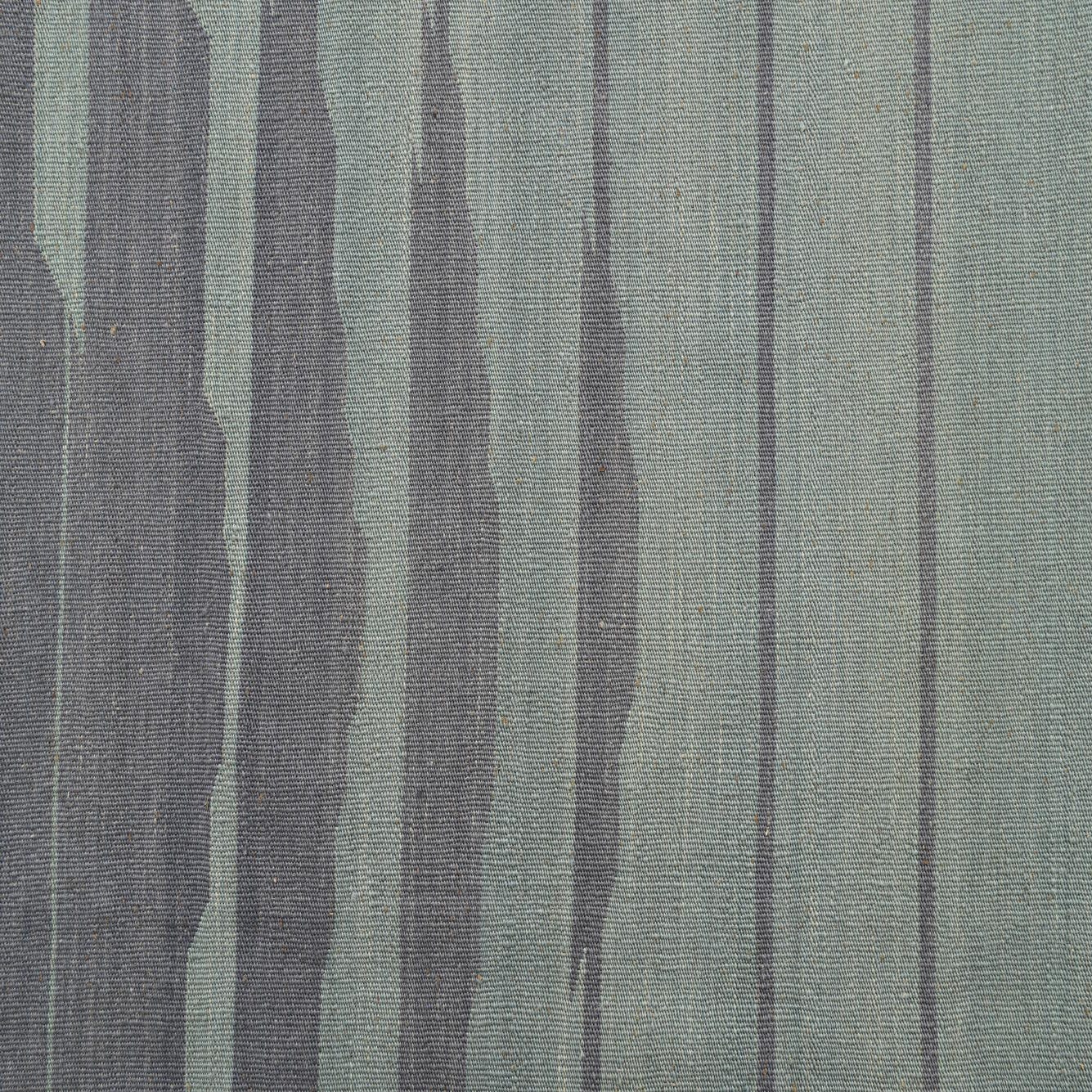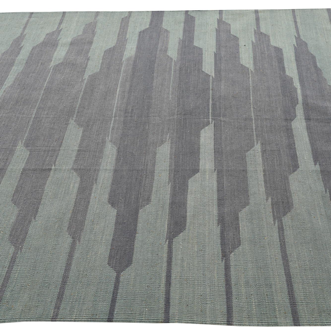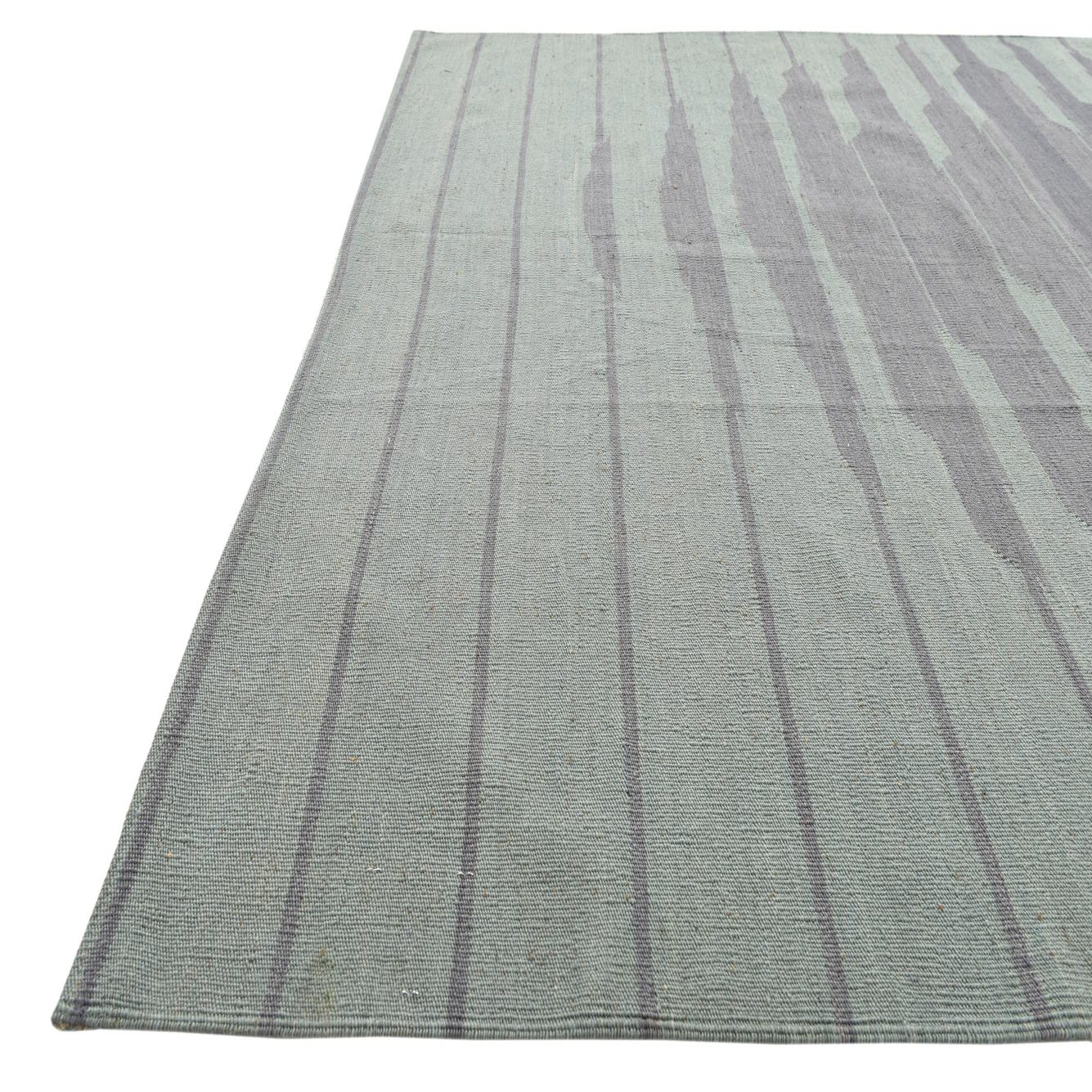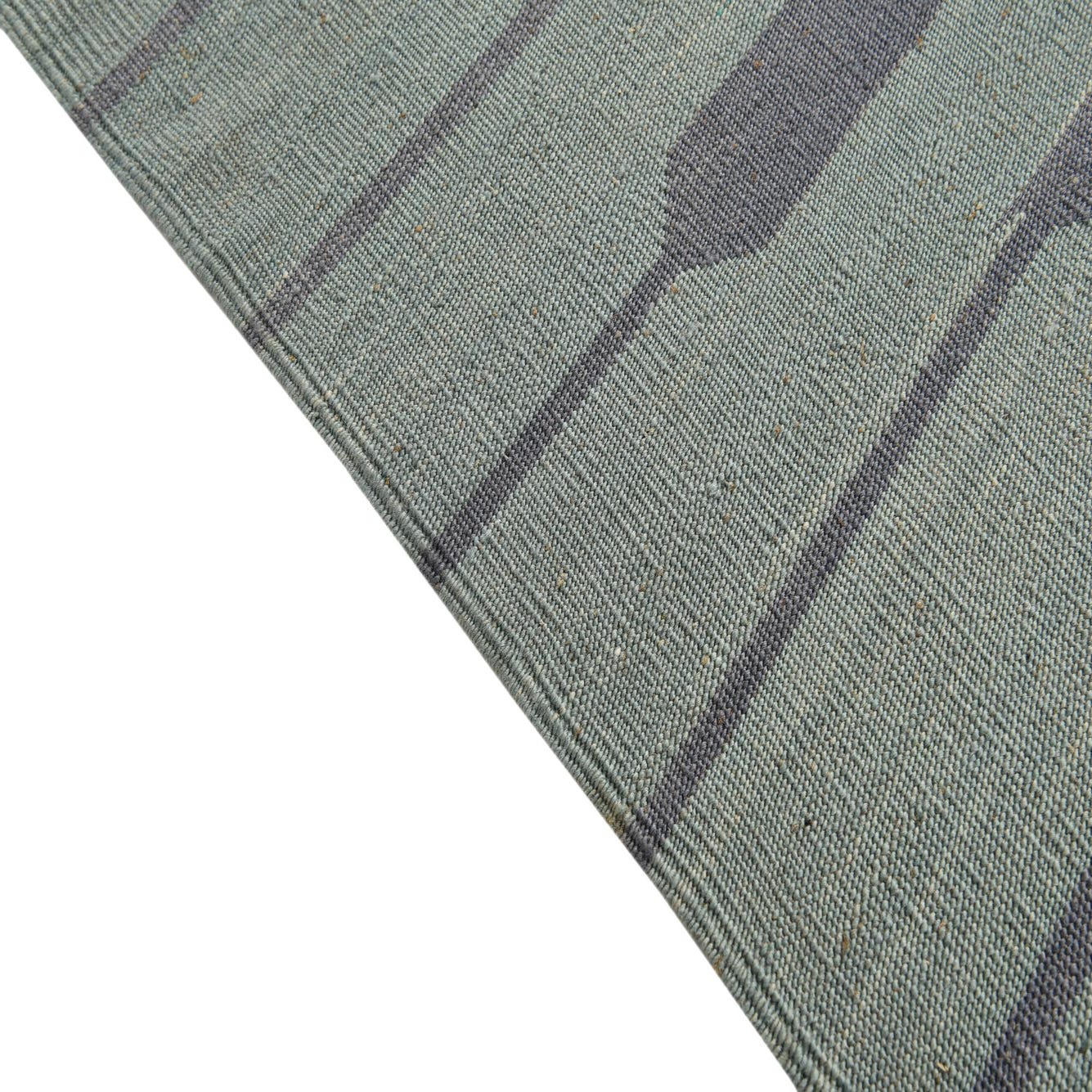 The Kilim Modern Collection offers a fresh take on traditional flatweave rugs, and this 5x8 hand-woven piece is no exception. Made from 100% wool, the rug presents a light green background that exudes a sense of tranquility. The pattern features a distinct, contemporary design comprised of horizontal blurred stripes in various shades of blue, creating an abstract visual texture that resembles a serene, rippling body of water.