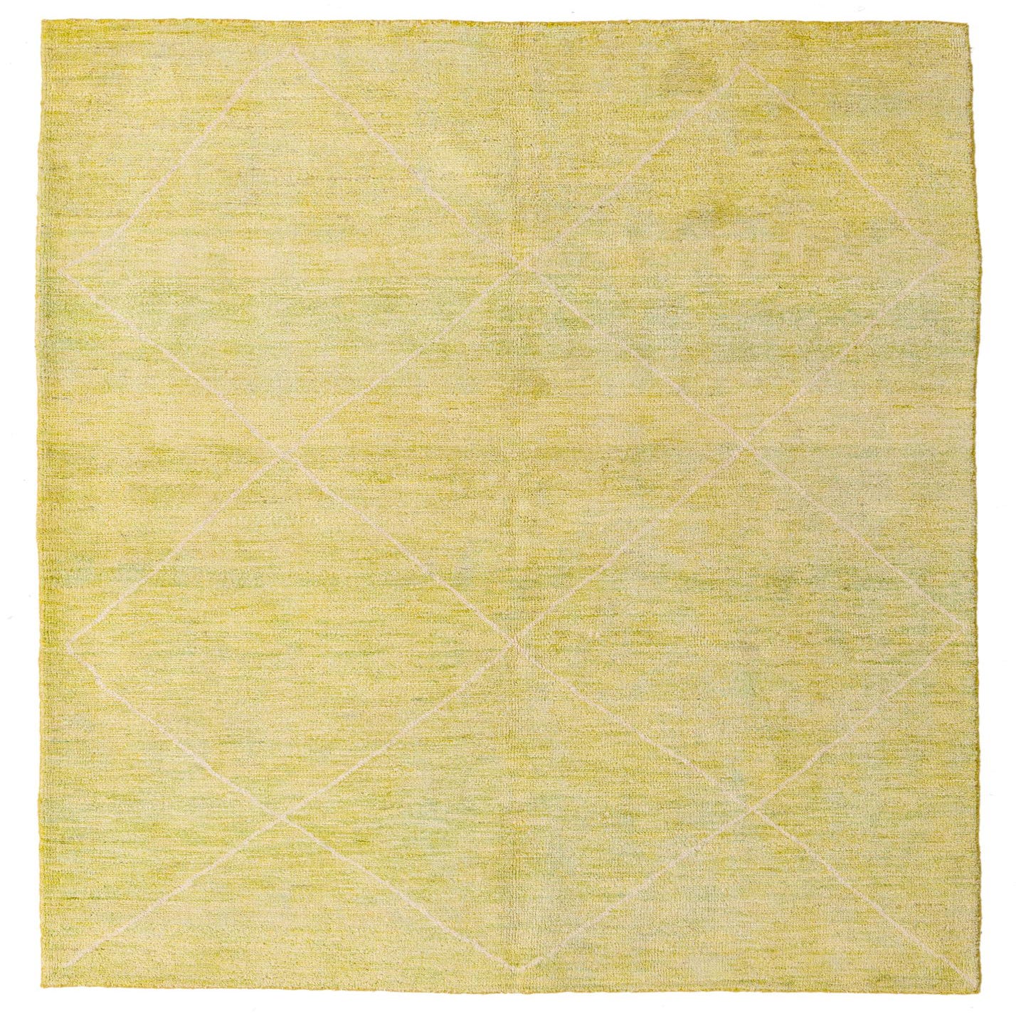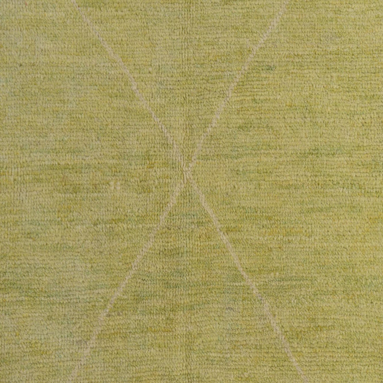 This Moroccan collection rug showcases a minimalist approach to traditional geometric motifs, with an all-over diamond pattern in ivory set against a light green background. The hand-knotted construction from 100% wool lends an authentic texture and ensures durability over time. The subtle variations in the light green background provide a sense of depth and understated elegance.