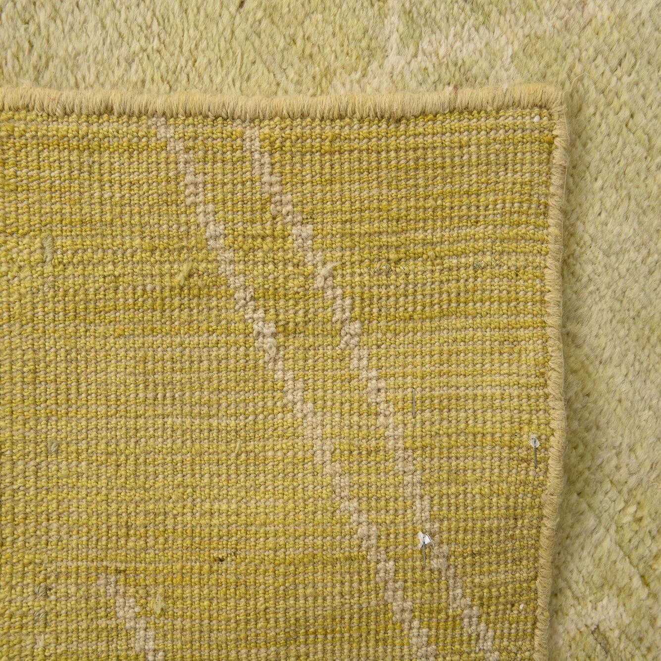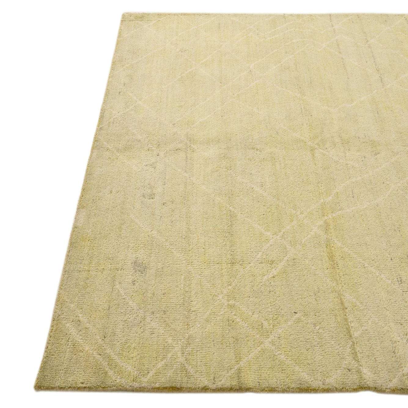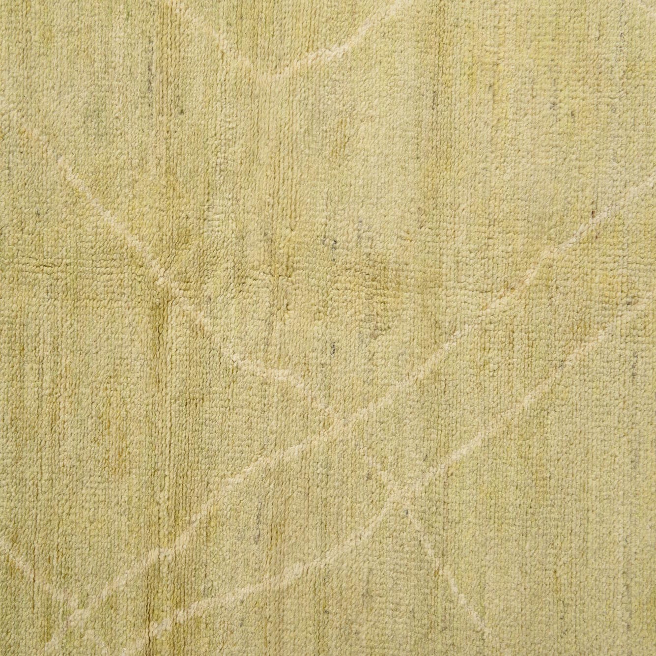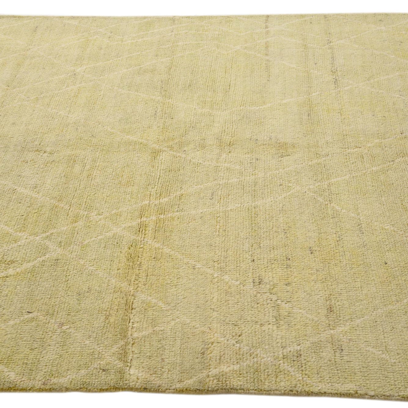 This Moroccan collection rug, measuring 5x8 feet, is hand-knotted of 100% wool, ensuring durability and a soft, plush feel underfoot. It features a subtle yet inviting light green background with a complementary ivory pattern. The rug's design boasts a series of intersecting lines that create a diamond lattice effect, which gives it a contemporary, geometric aesthetic.