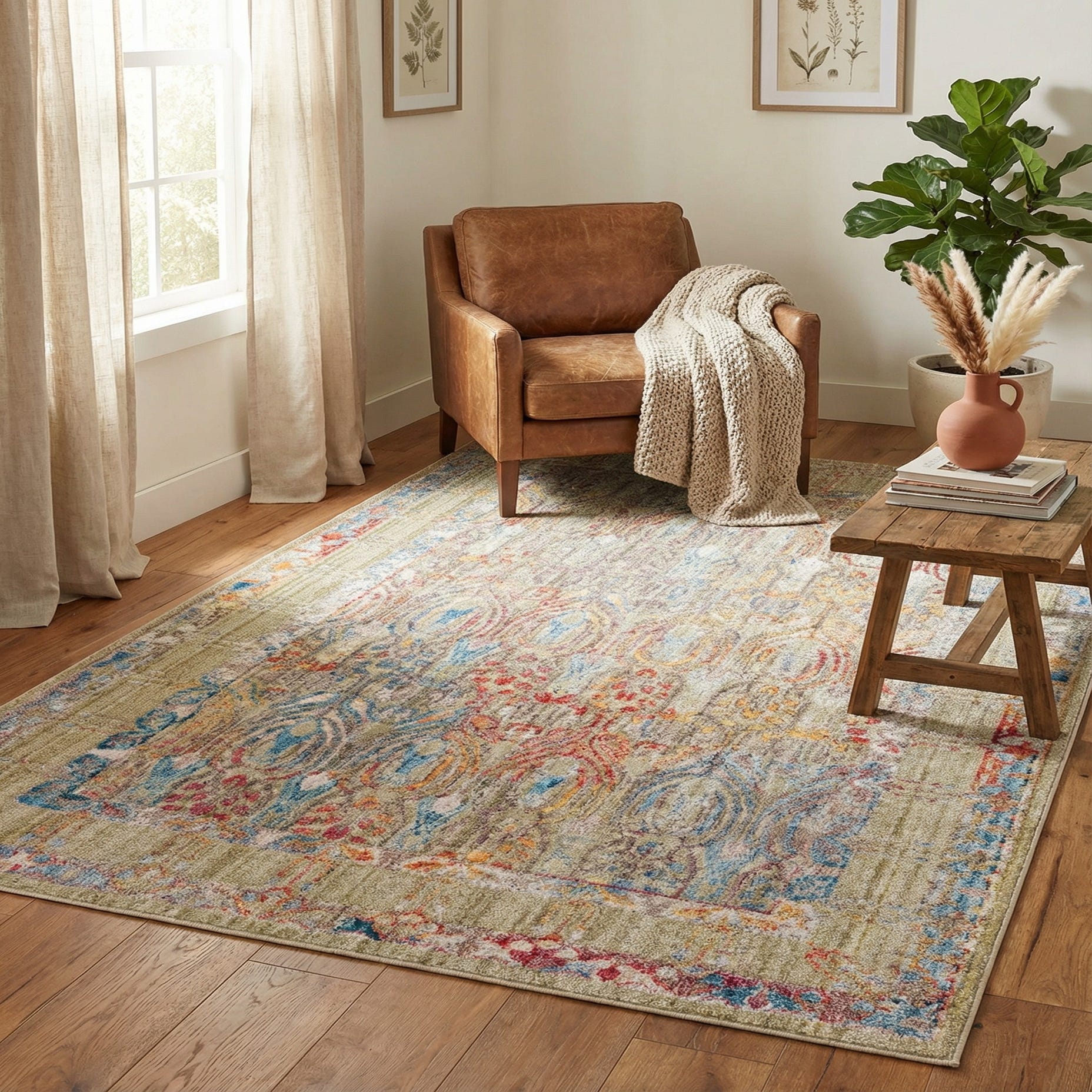 Place it under a coffee table to anchor a relaxed living room, use it to add color and pattern in a neutral bedroom, or layer it in a cozy reading nook with natural wood furniture and brass or matte-black accents. The palette and distressed styling work well with mid-century, bohemian, or casual-traditional interiors, and it pairs nicely with linen upholstery, rattan elements, and warm metallic finishes.