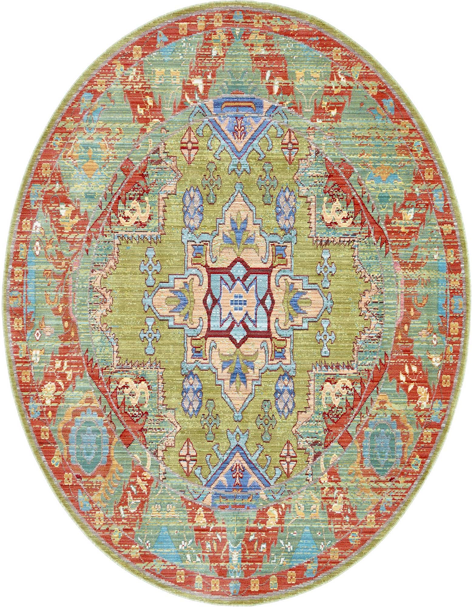 Primary color is Light Green. Colors in this rug include: Light Green, Beige, Blue, Navy Blue, Peach, Red, Tan, Puce, Yellow.