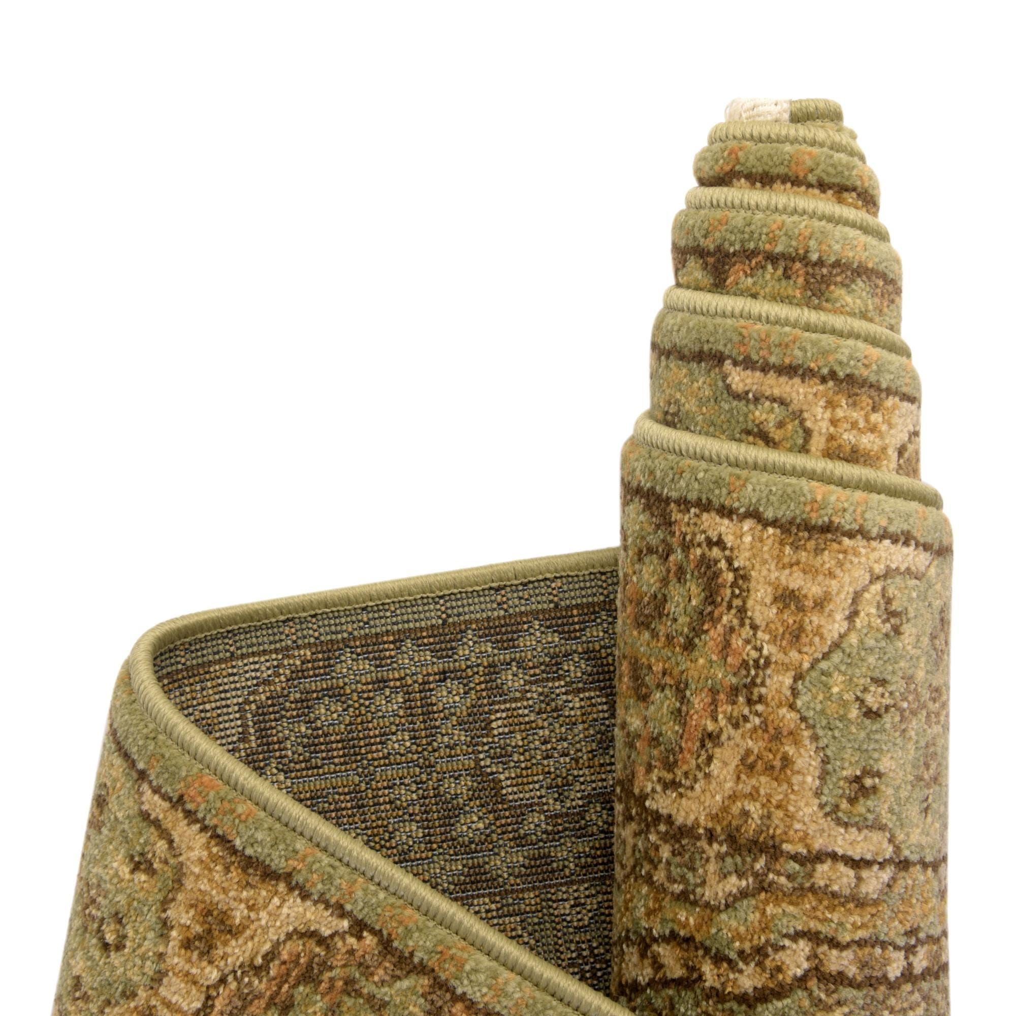 A classic medallion pattern centers this round rug, set against a light green field that gives the design a soft, grounded presence. Layers of cream, light brown, and deeper brown trace the ornate motifs and concentric borders, creating a subtle contrast without overpowering the overall palette. The pile has a smooth, low-profile feel typical of machine-made construction, and the synthetic fiber provides a consistent texture that is pleasant underfoot.