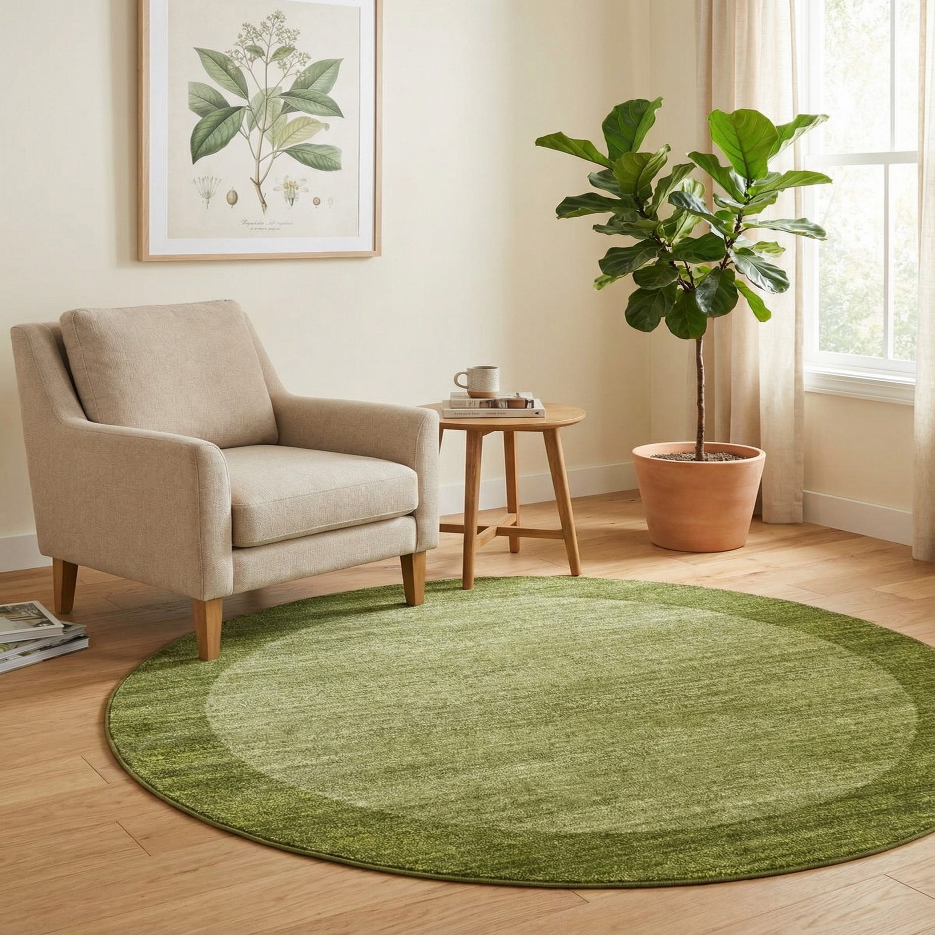 This rug works nicely beneath a small round dining table or bistro set, as an anchor for a cozy reading nook, or layered under a circular coffee table in a living room. The green palette complements natural wood, rattan, and warm neutrals, and fits well with Scandinavian, mid-century modern, cottage, or contemporary interiors. Its rounded shape softens angular furniture groupings and brings a refreshed, grounded look to bedrooms, sunrooms, or home offices.
